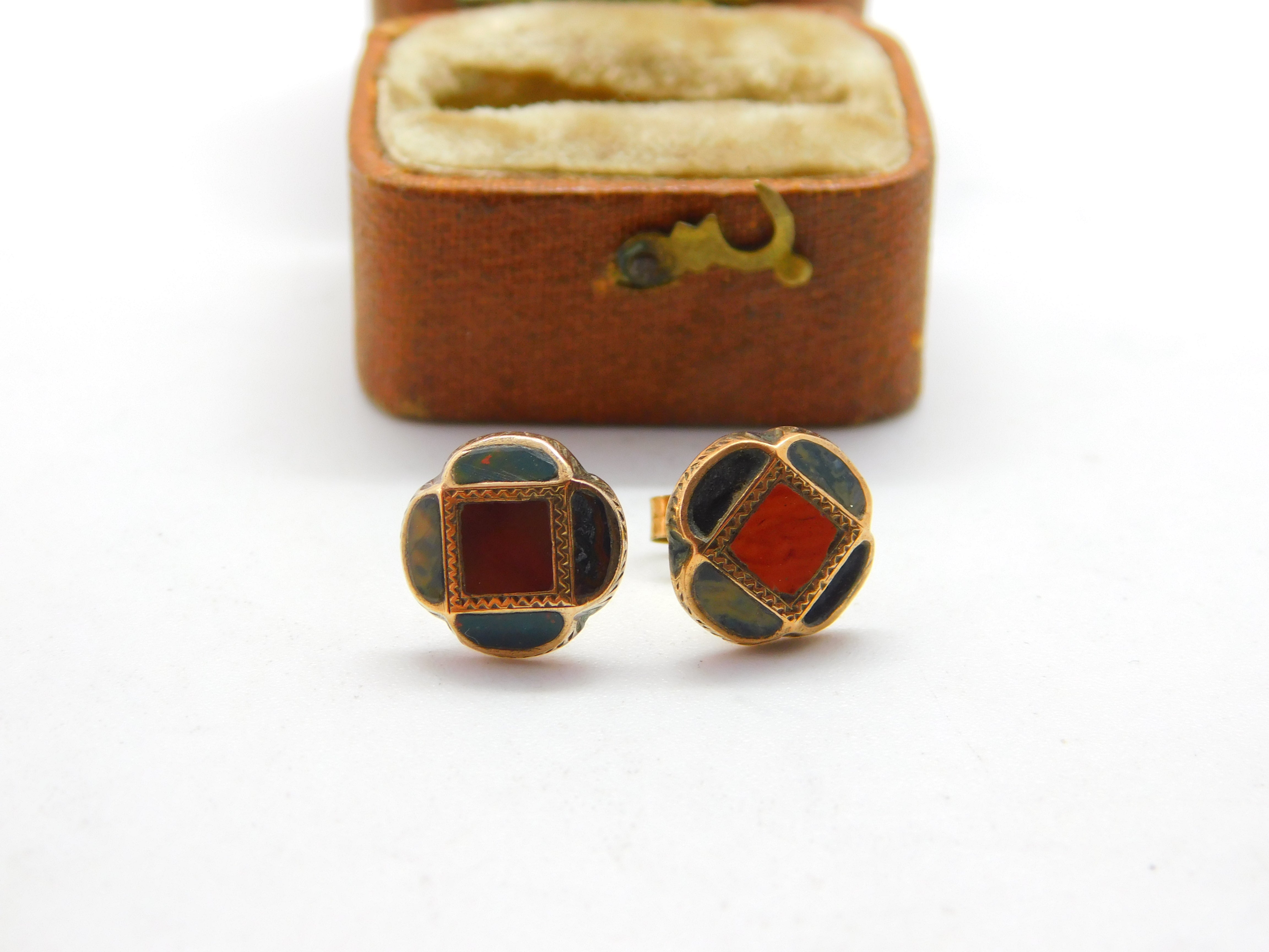 Victorian Scottish 9ct Gold, Bloodstone & Agate Floral Stud Earrings Antique