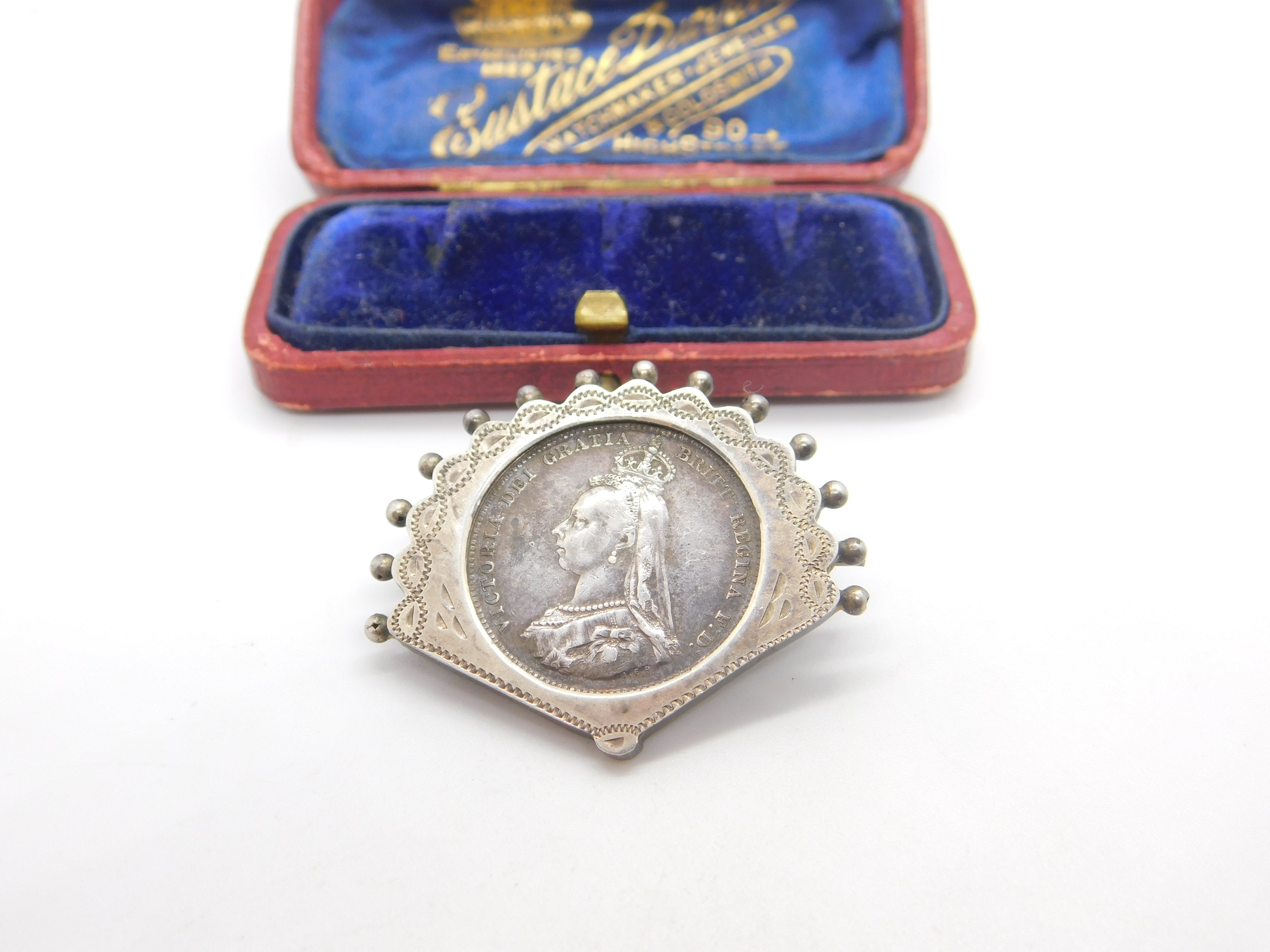 Victorian Sterling Shilling Coin Fan Form Brooch 1887 Antique Jubilee Year
