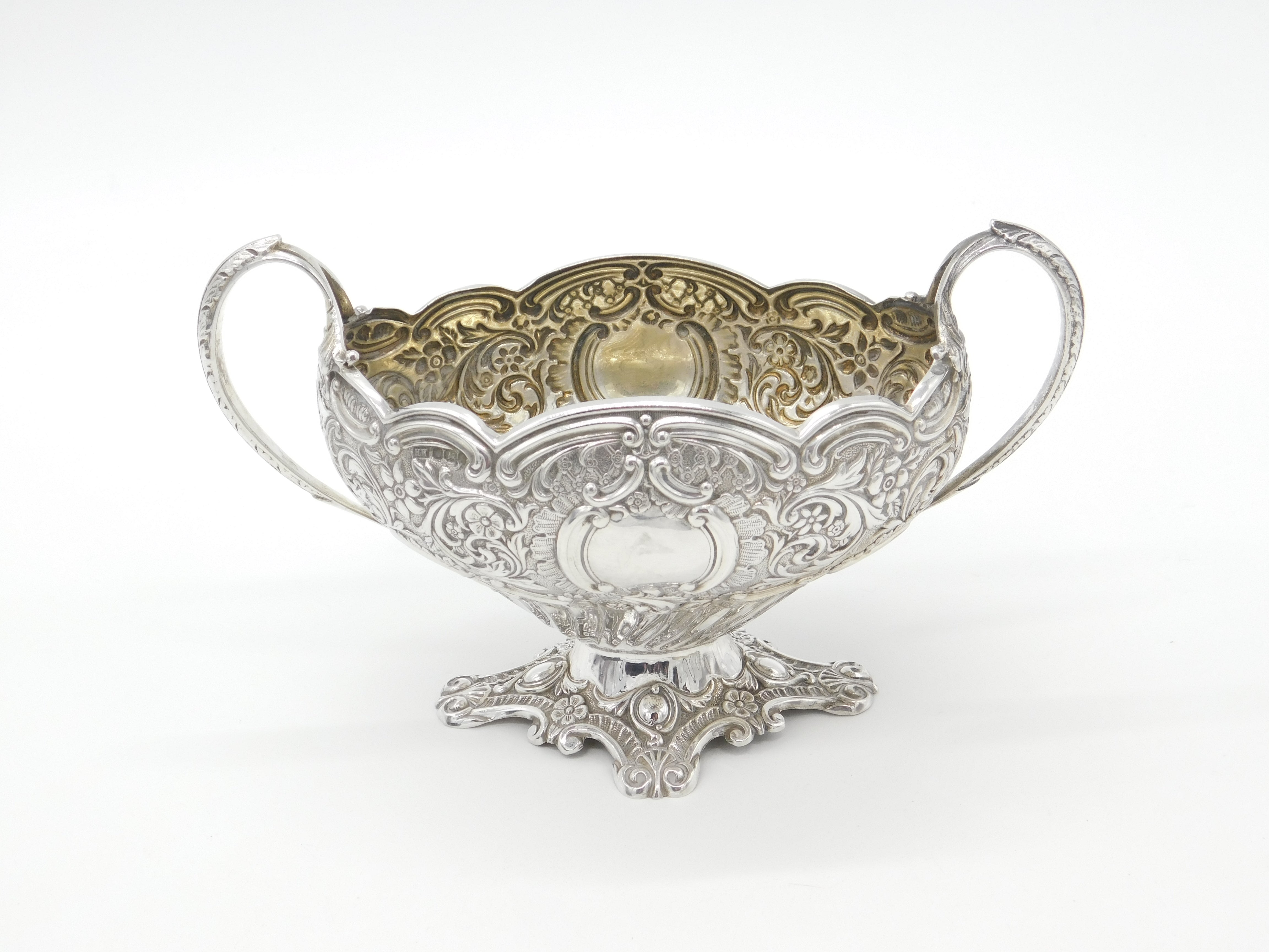 Victorian Sterling Floral Two-Handled Pedestal Treat Dish Antique 1895 Sheffield