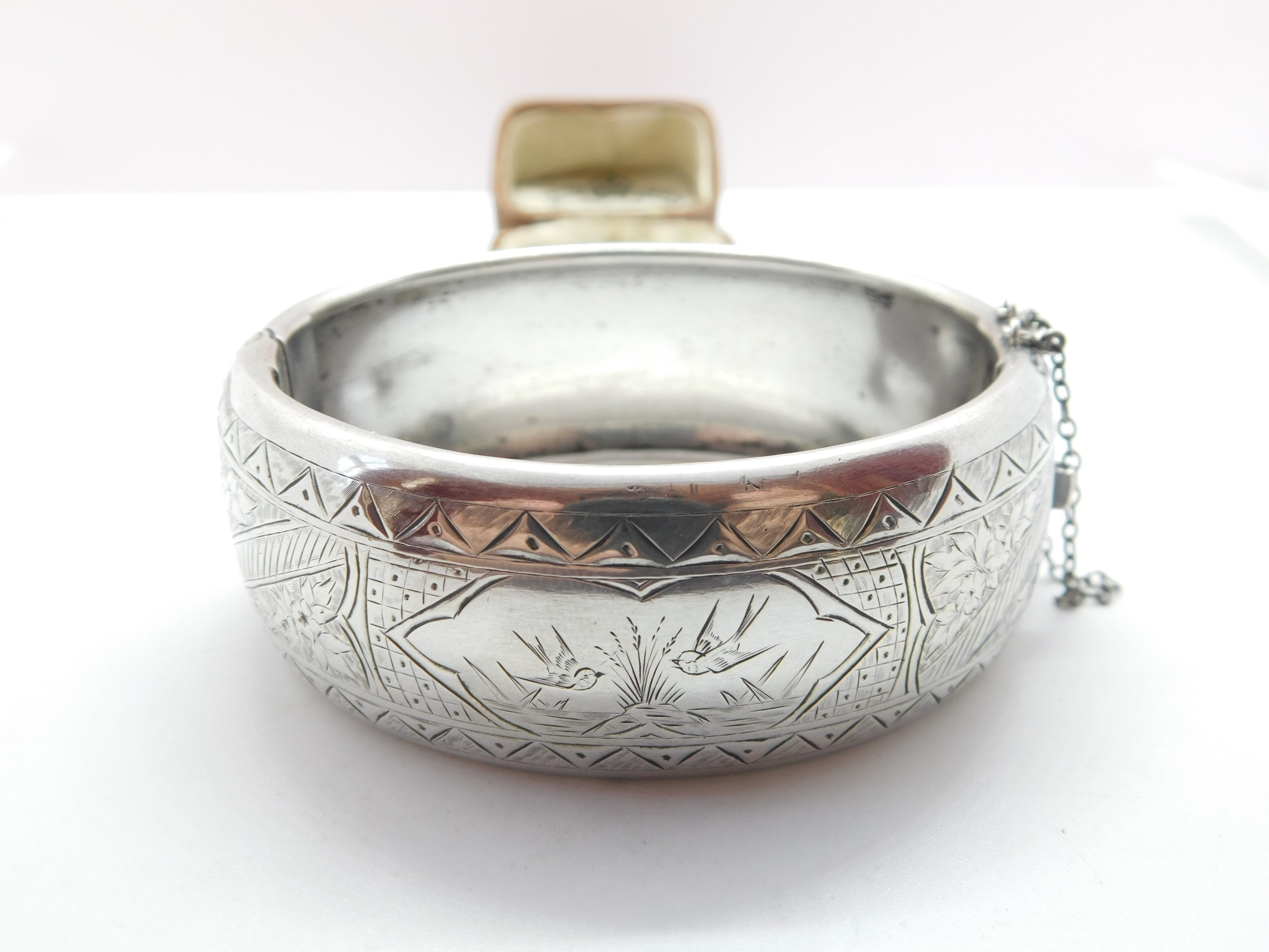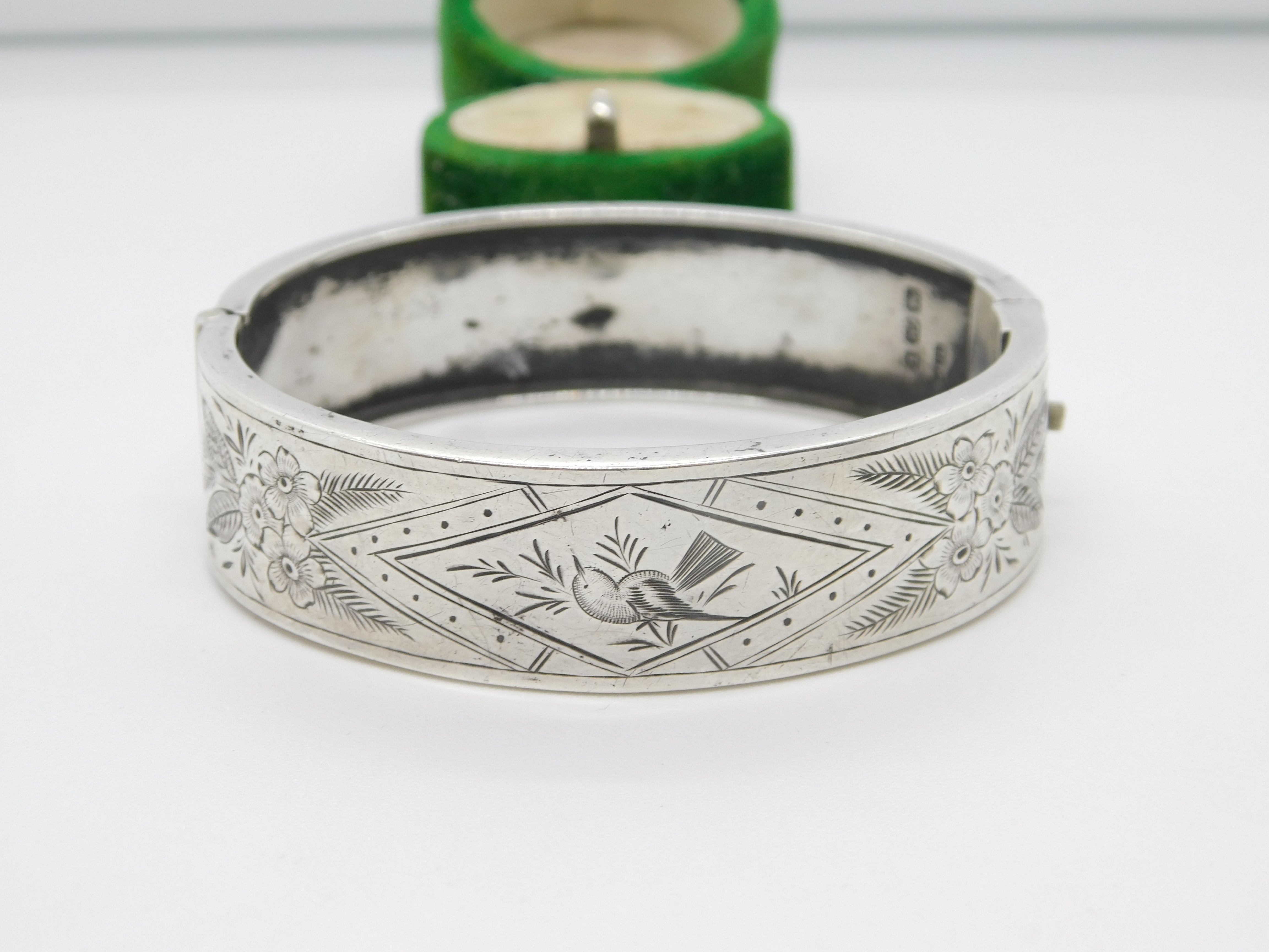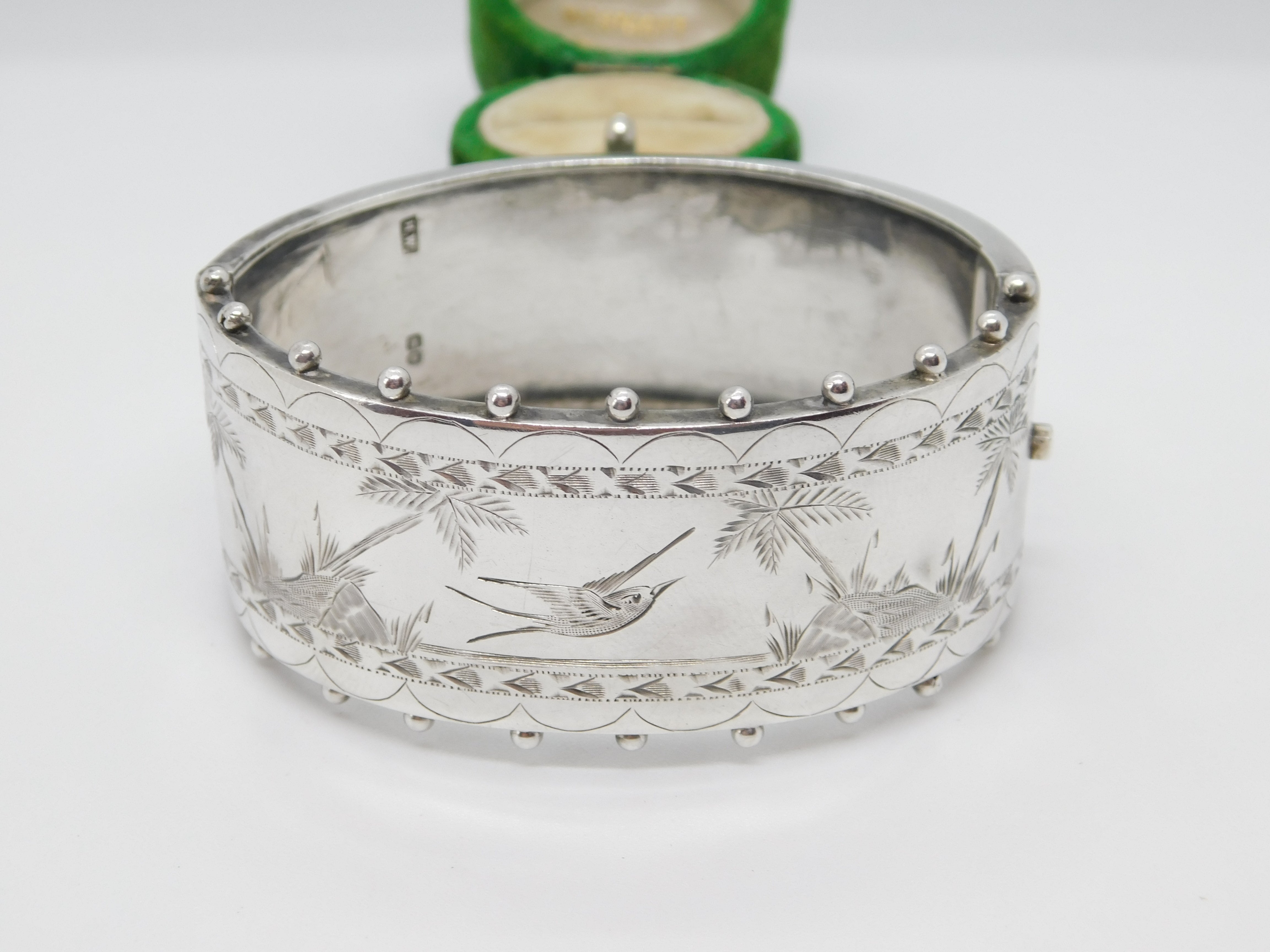 Victorian Sterling Silver Aesthetic Bird Floral Pattern Bangle Antique 1883 Birmingham