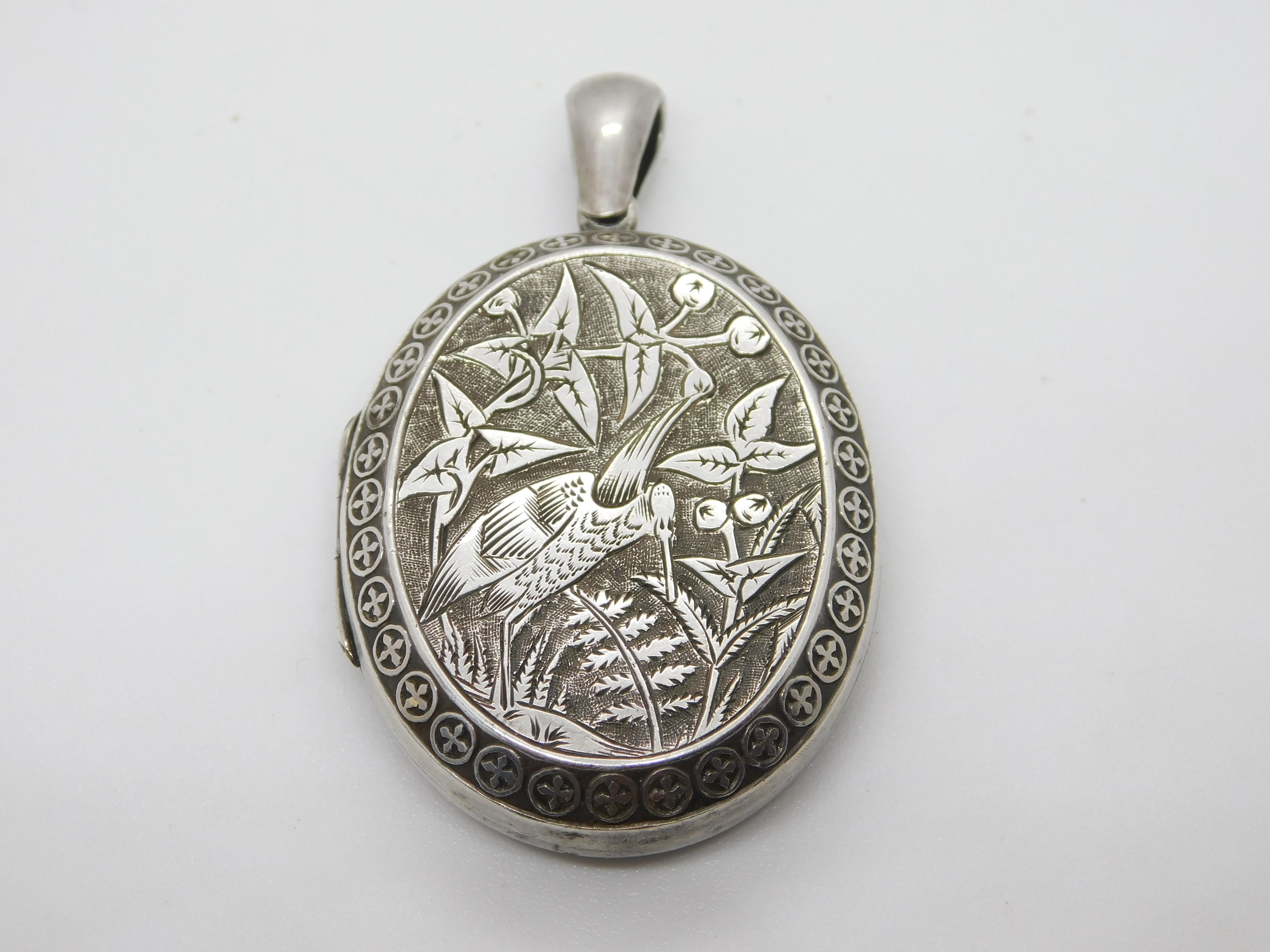 Victorian Sterling Silver Aesthetic Leaf & Crane Sweetheart Locket Antique c1880