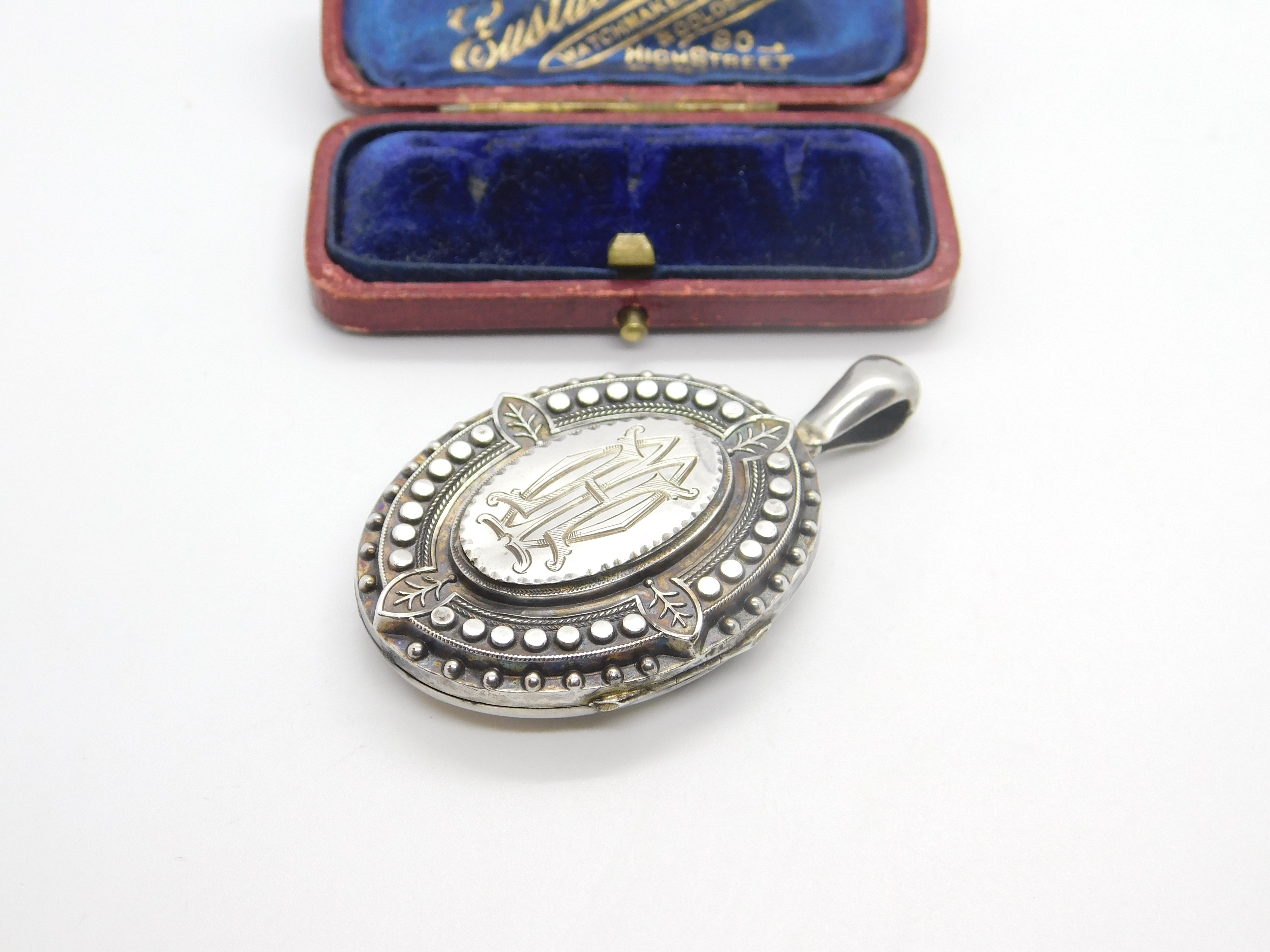 Victorian Sterling Silver Large Monogram Sweetheart Locket Necklace Antique c1860