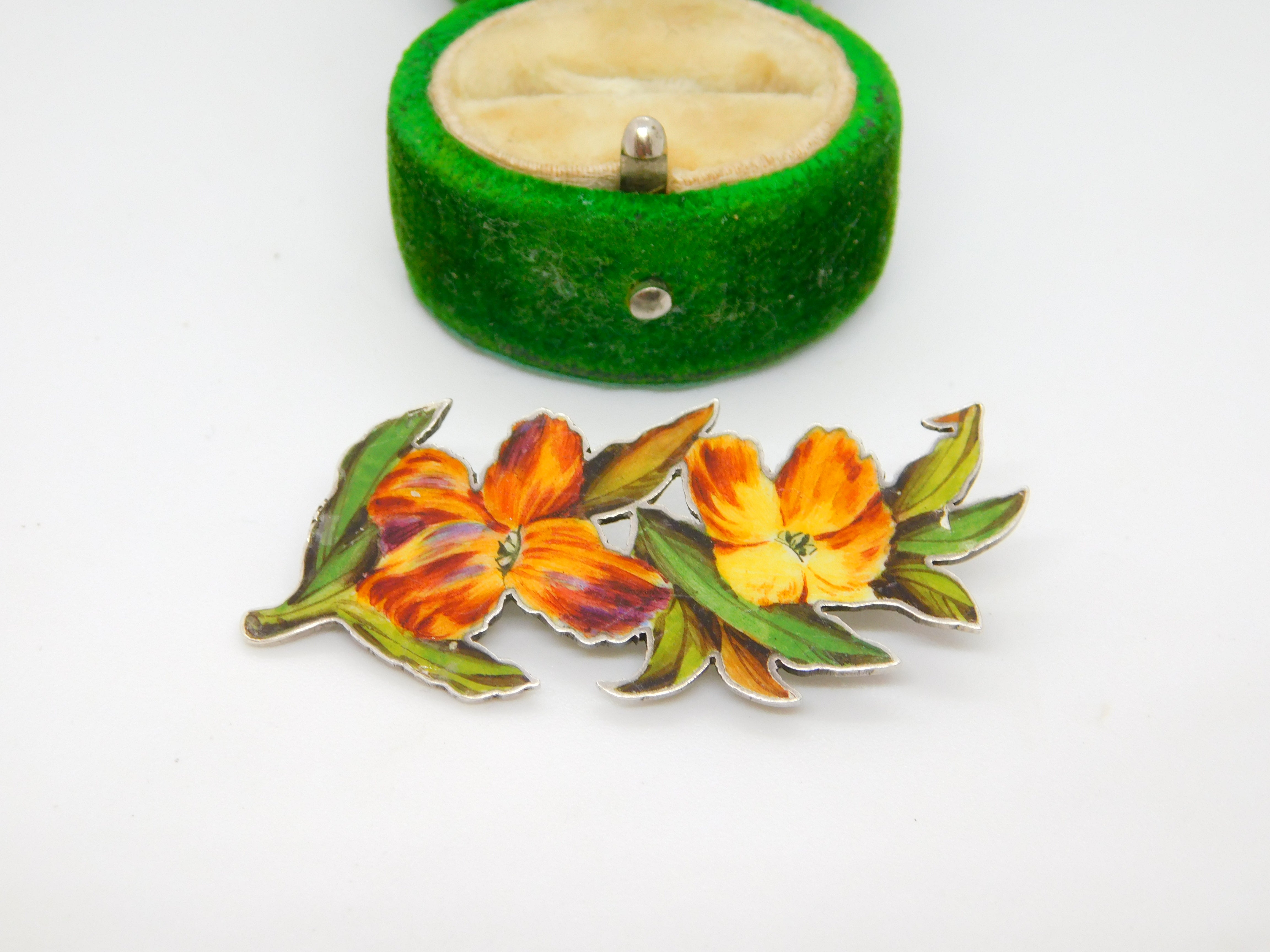 Victorian Sterling Silver Lily Flower Enamel Brooch Antique 1889 Birmingham