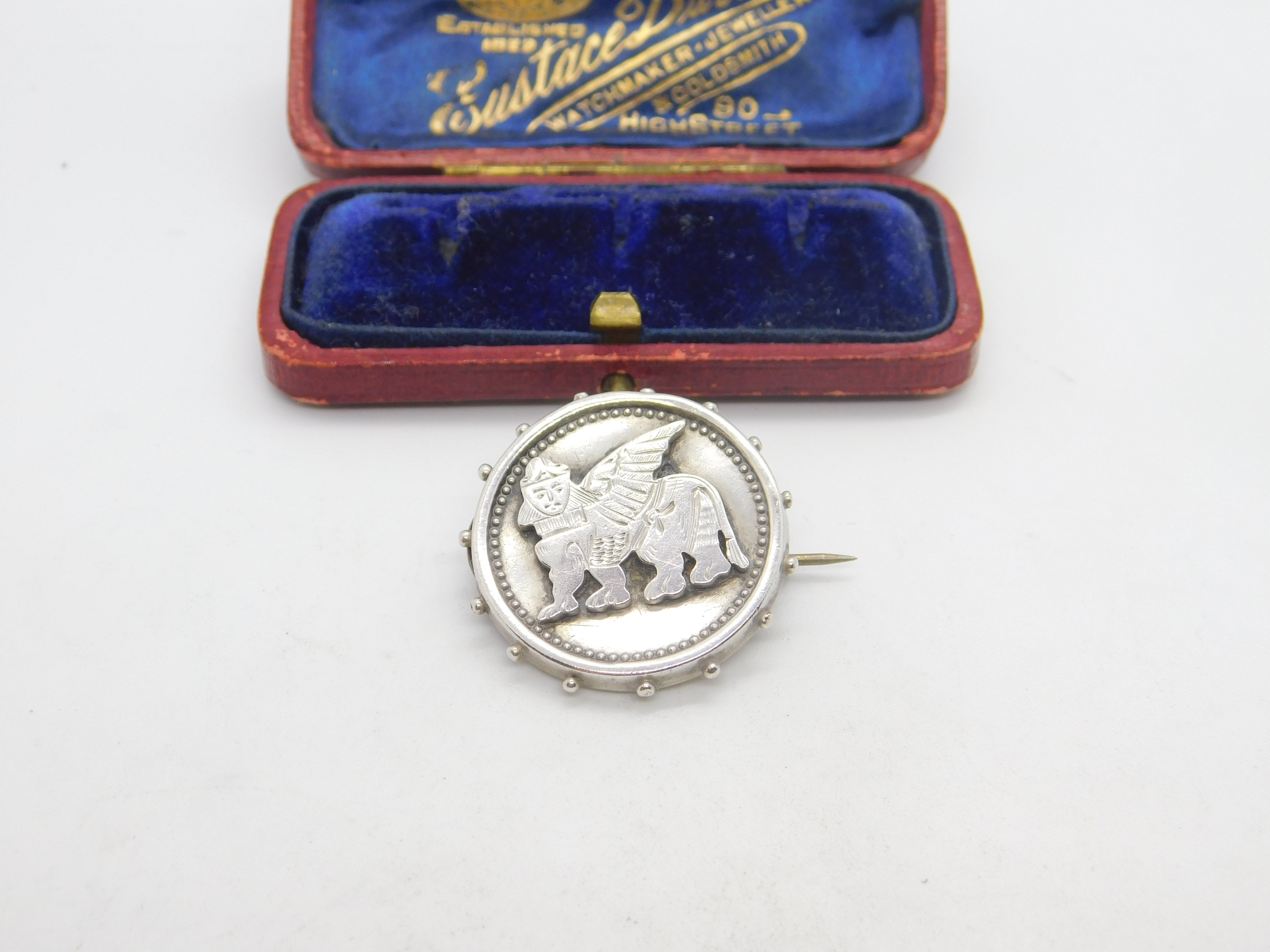 Victorian Sterling Silver Lion of Venice Button Brooch Antique c1880