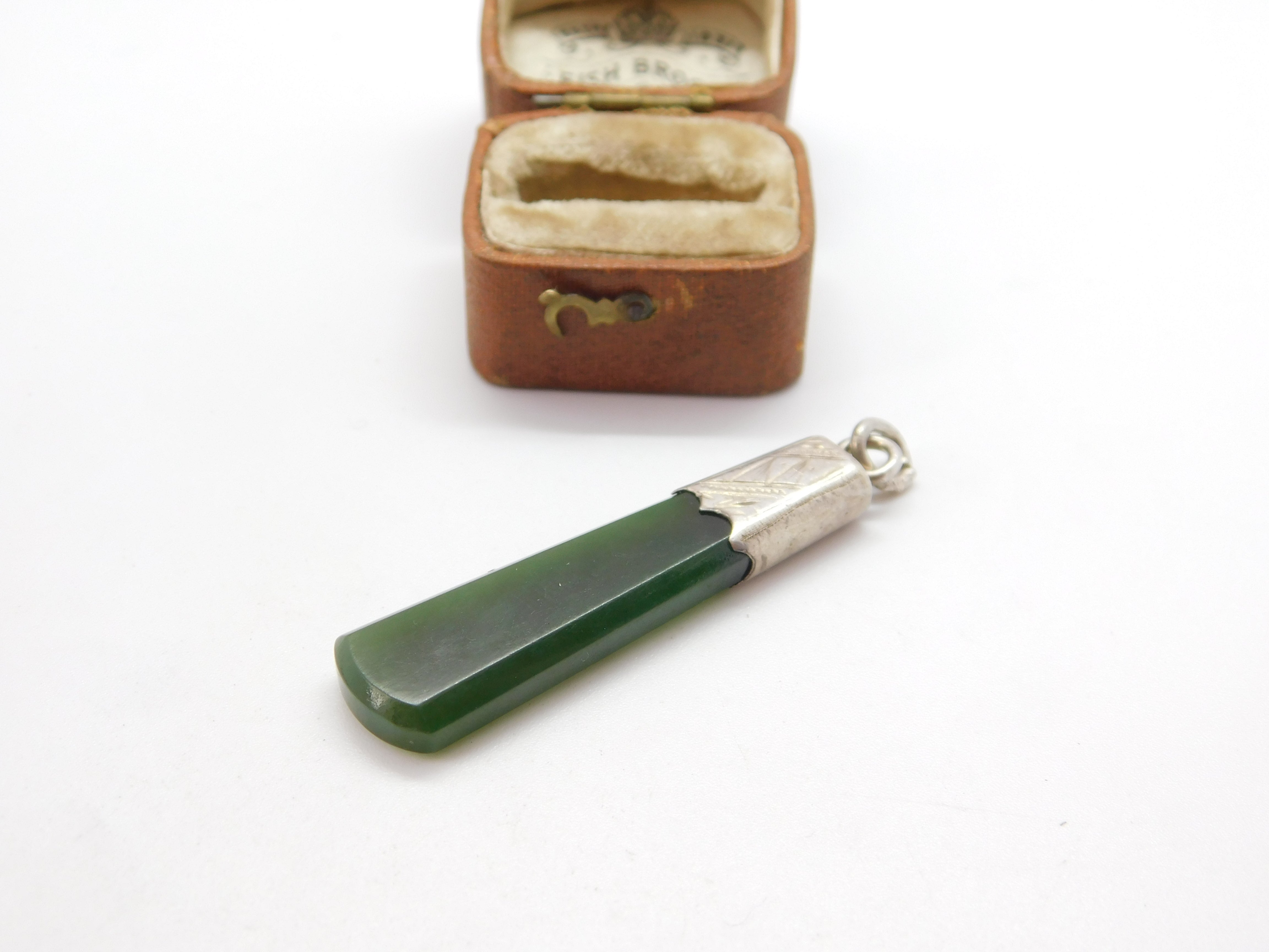 Victorian Sterling Silver Mounted Nephrite Jade Drop Pendant c1890 Antique