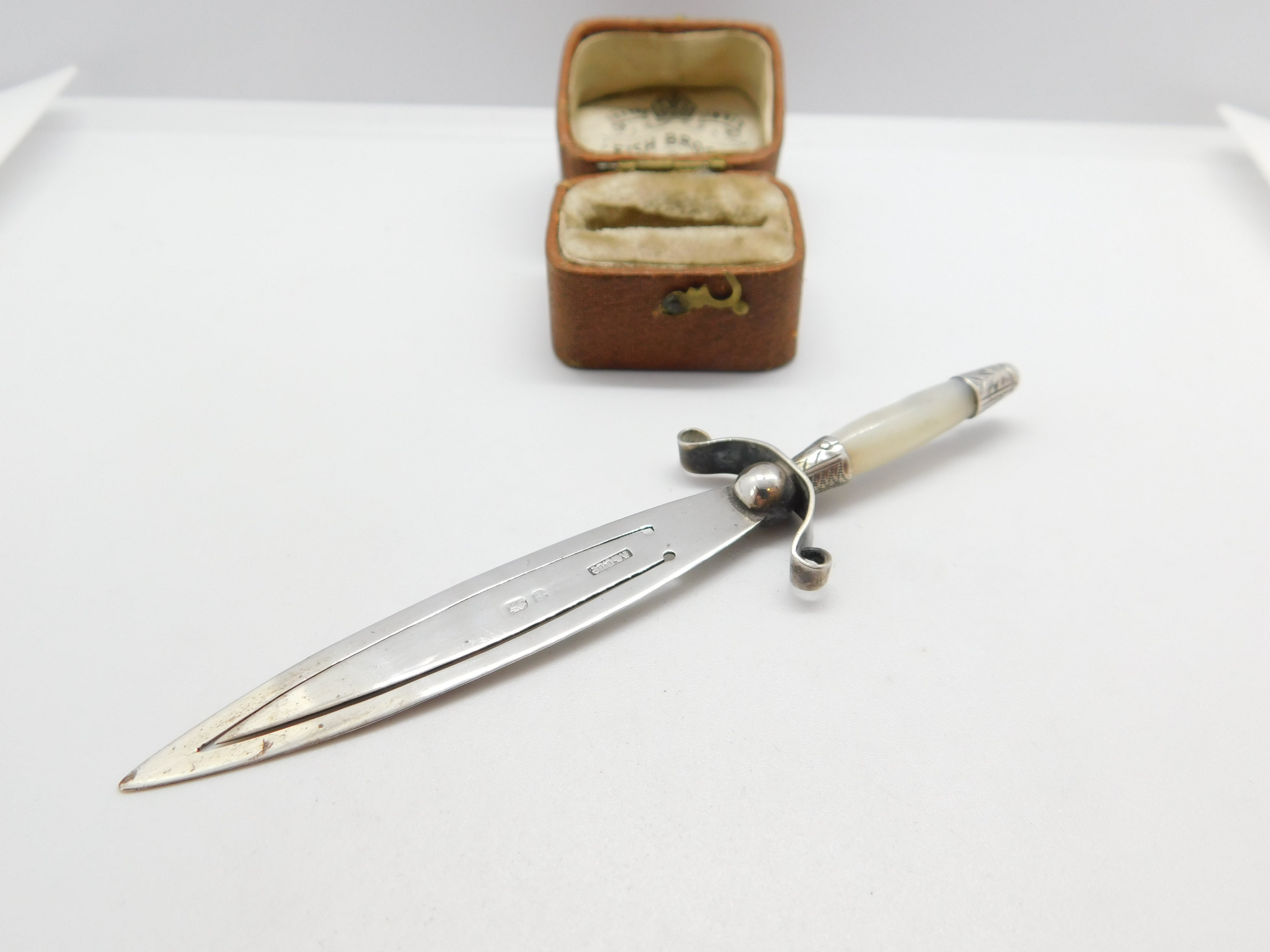 Victorian Sterling Silver Mother of Pearl Sword Shape Bookmark 1889 Antique