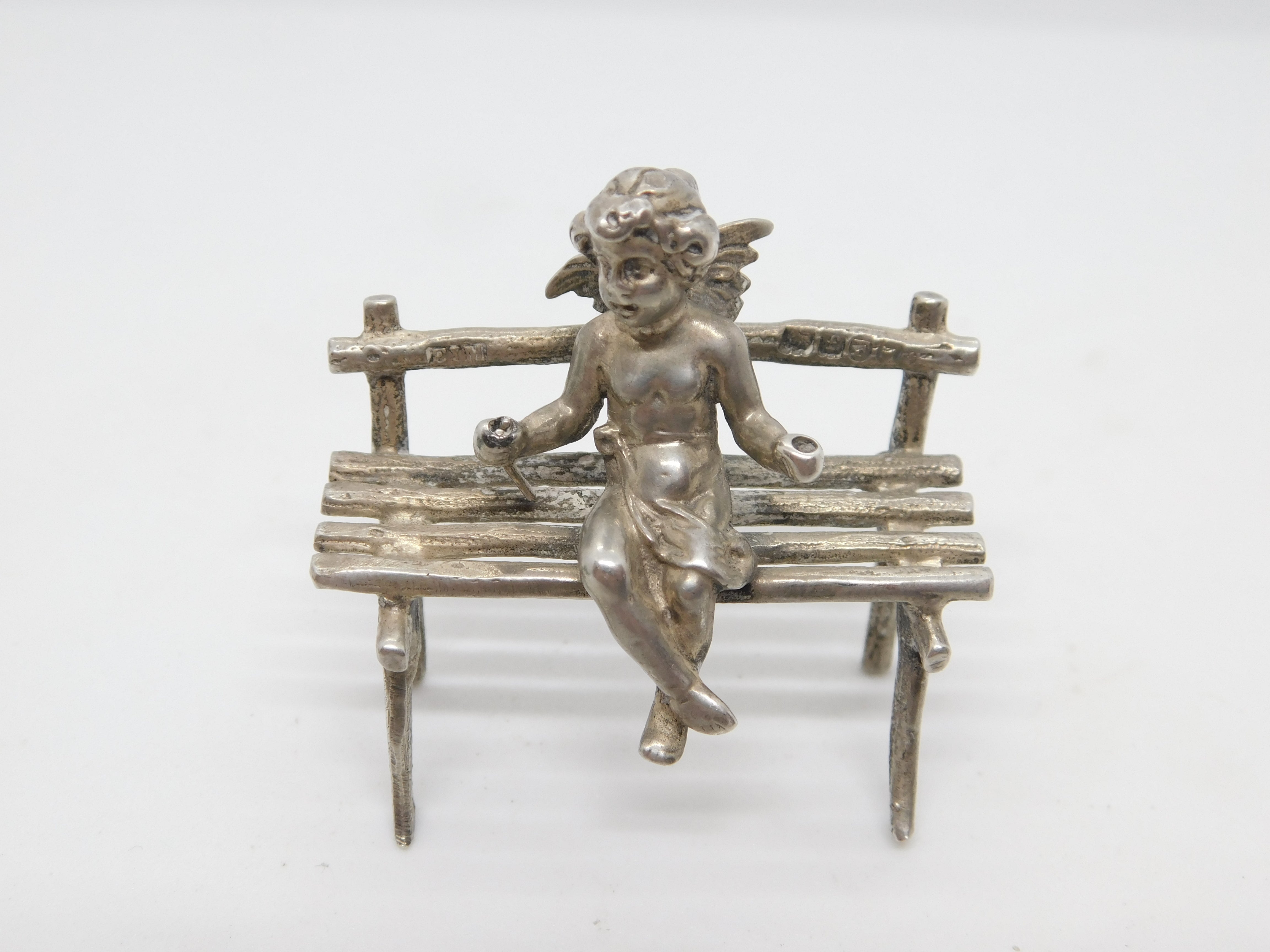 Victorian Sterling Silver Miniature Putti Cherub on Bench Figure Antique 1901 London