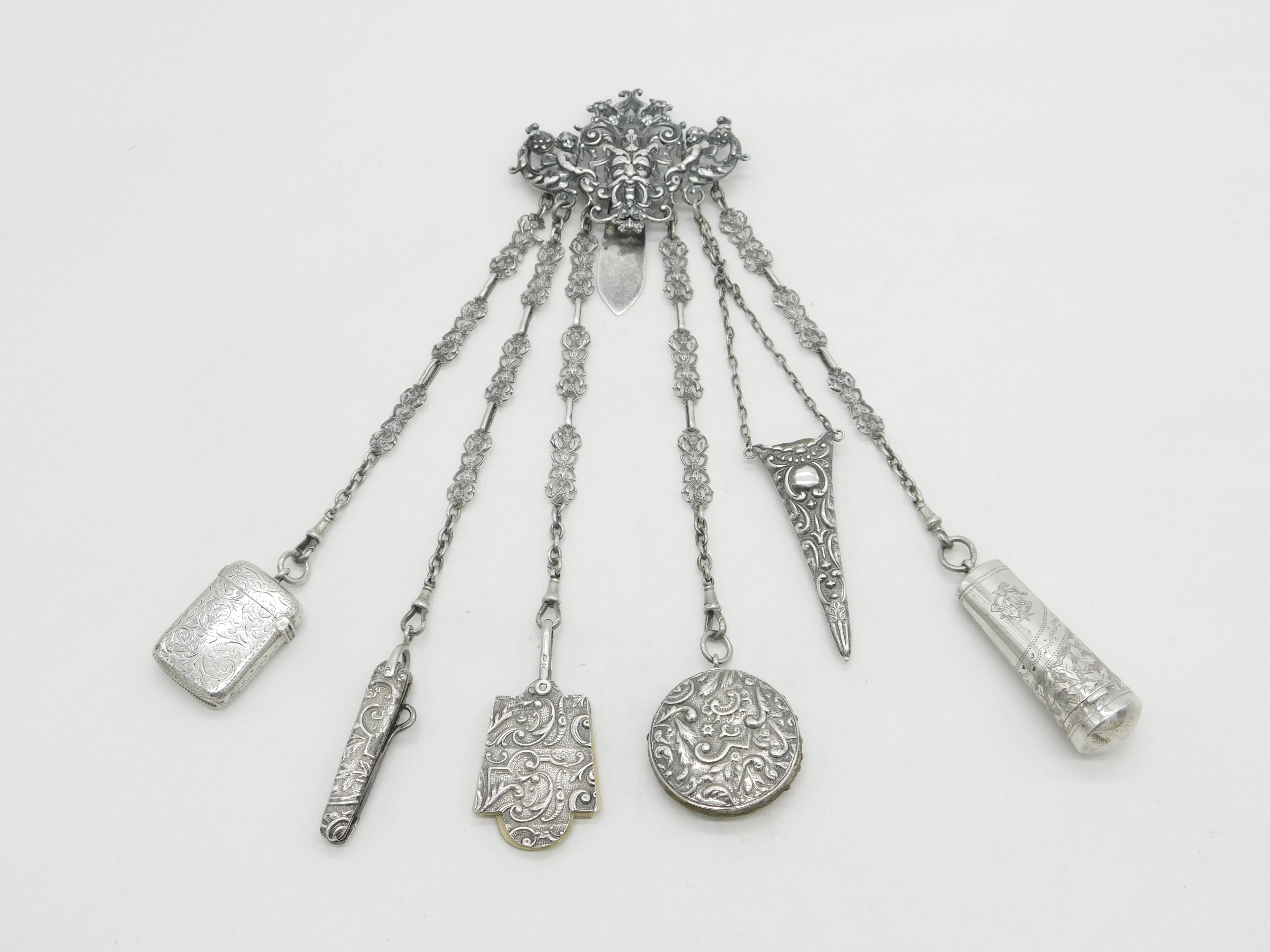 Victorian Sterling Silver Sewing Chatelaine & Tools 1893 Birmingham Antique
