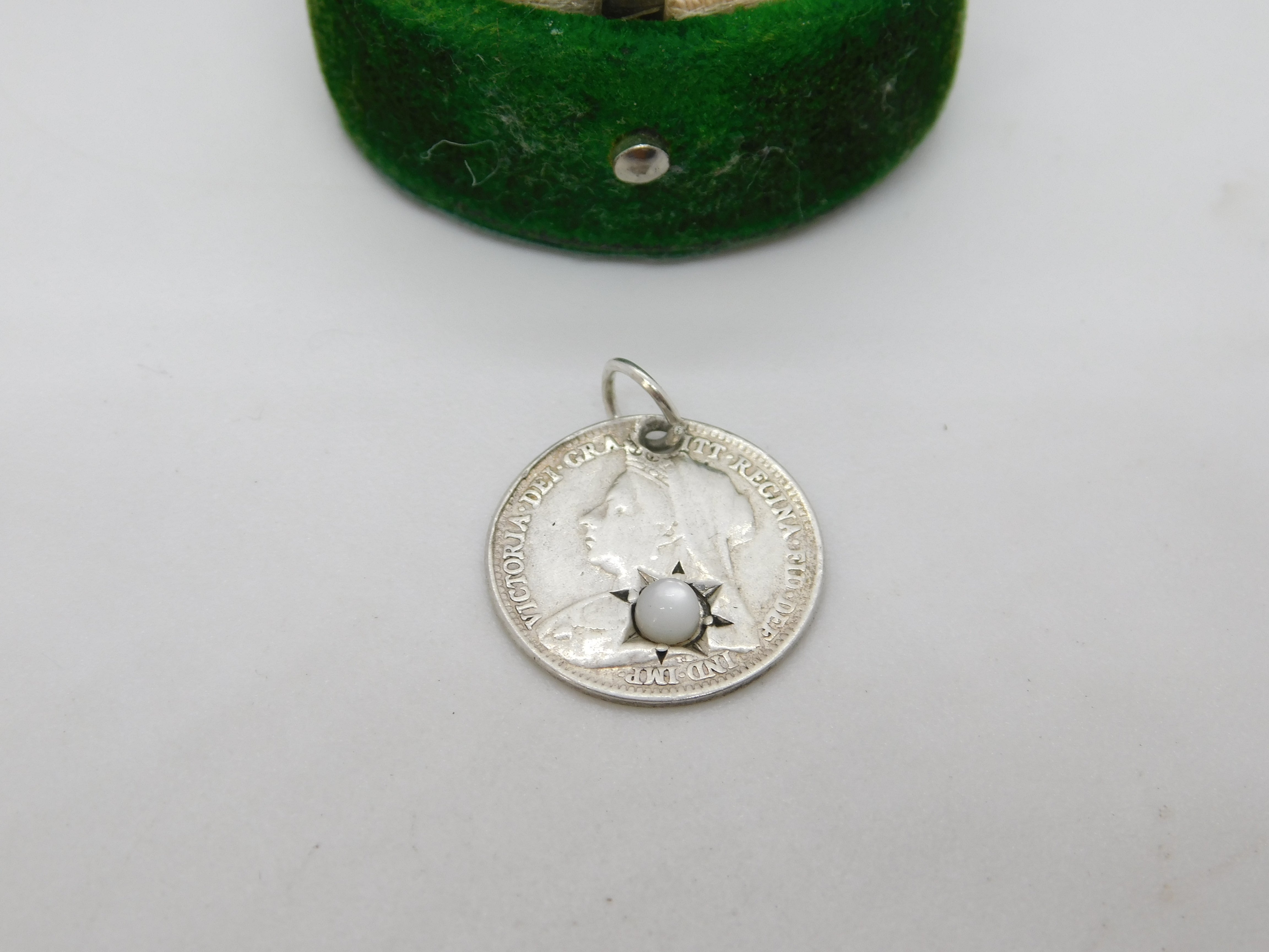 Victorian Sterling Silver Threepence Coin Moonstone Lucky Charm Antique 1897