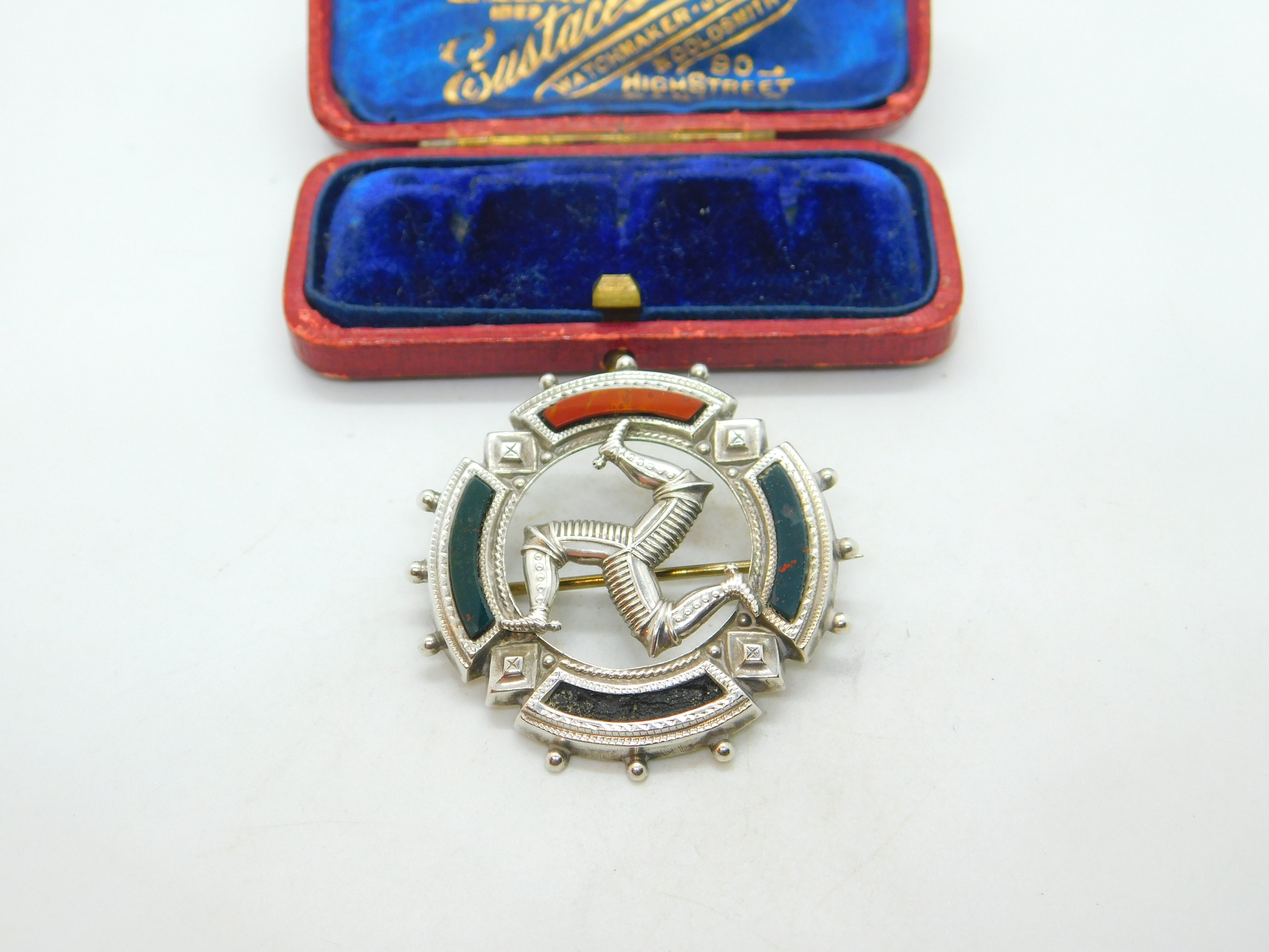 Victorian Sterling Silver, Bloodstone & Agate 'Three Legs Of Mann' Brooch c1890