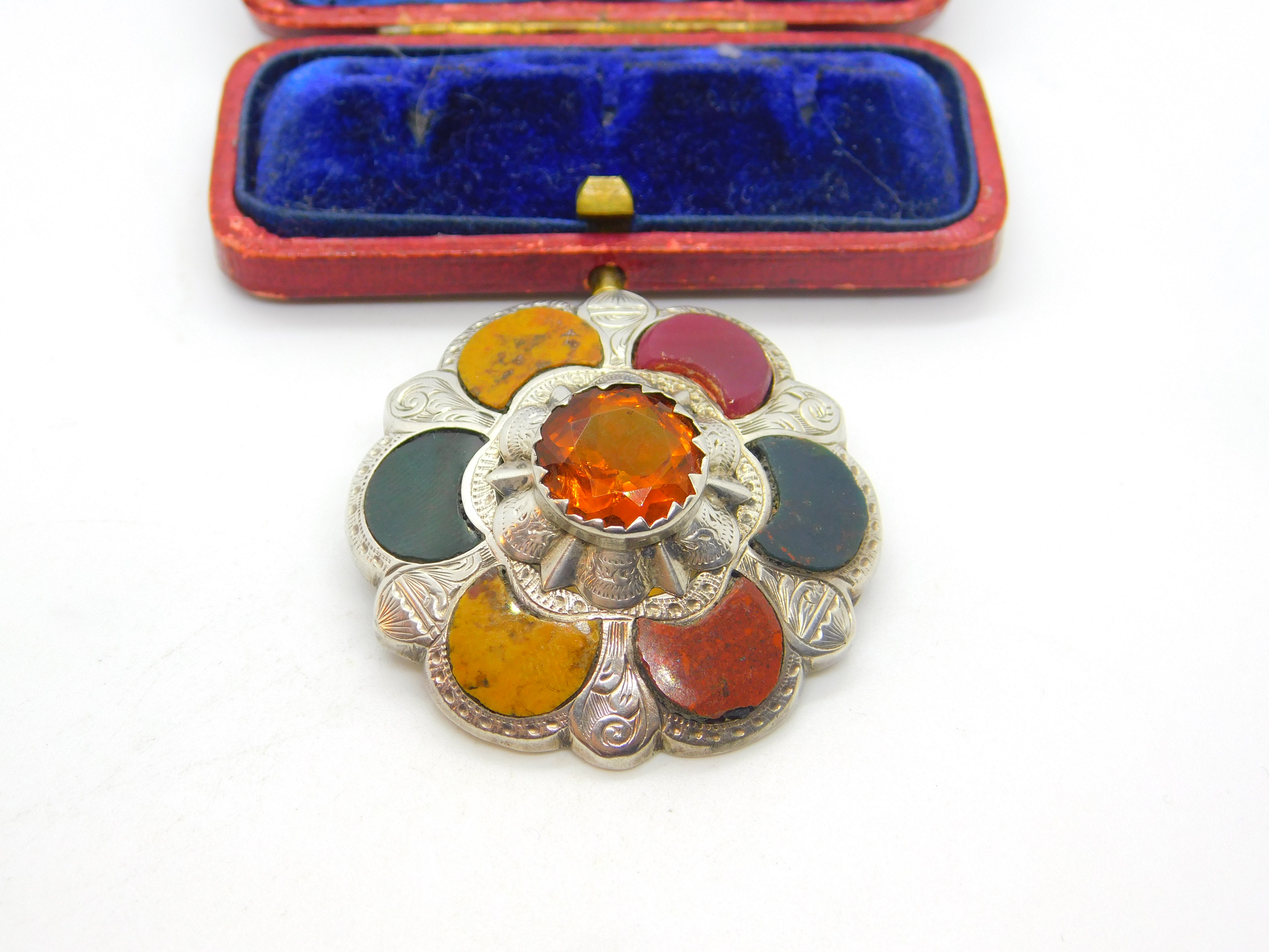 Victorian Sterling Silver, Bloodstone, Agate & Citrine Kilt Brooch Antique c1860