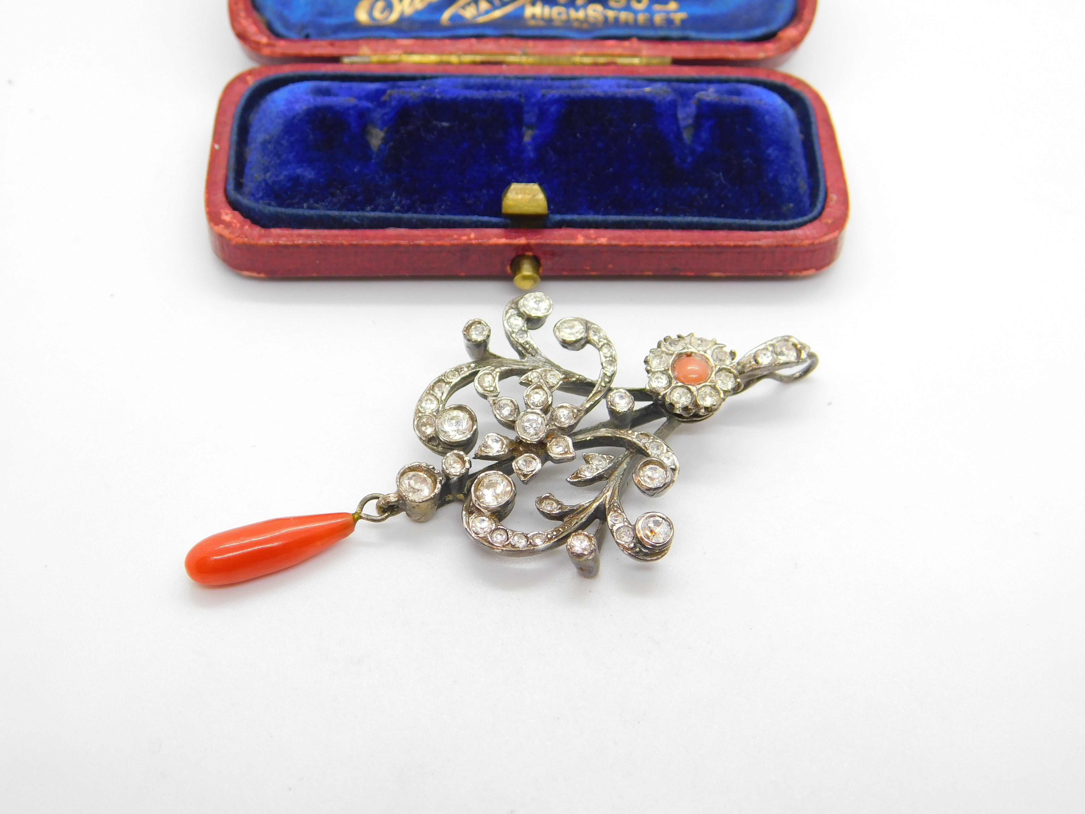 Victorian Sterling Silver, Diamond Paste & Coral Floral Drop Pendant Antique c1900