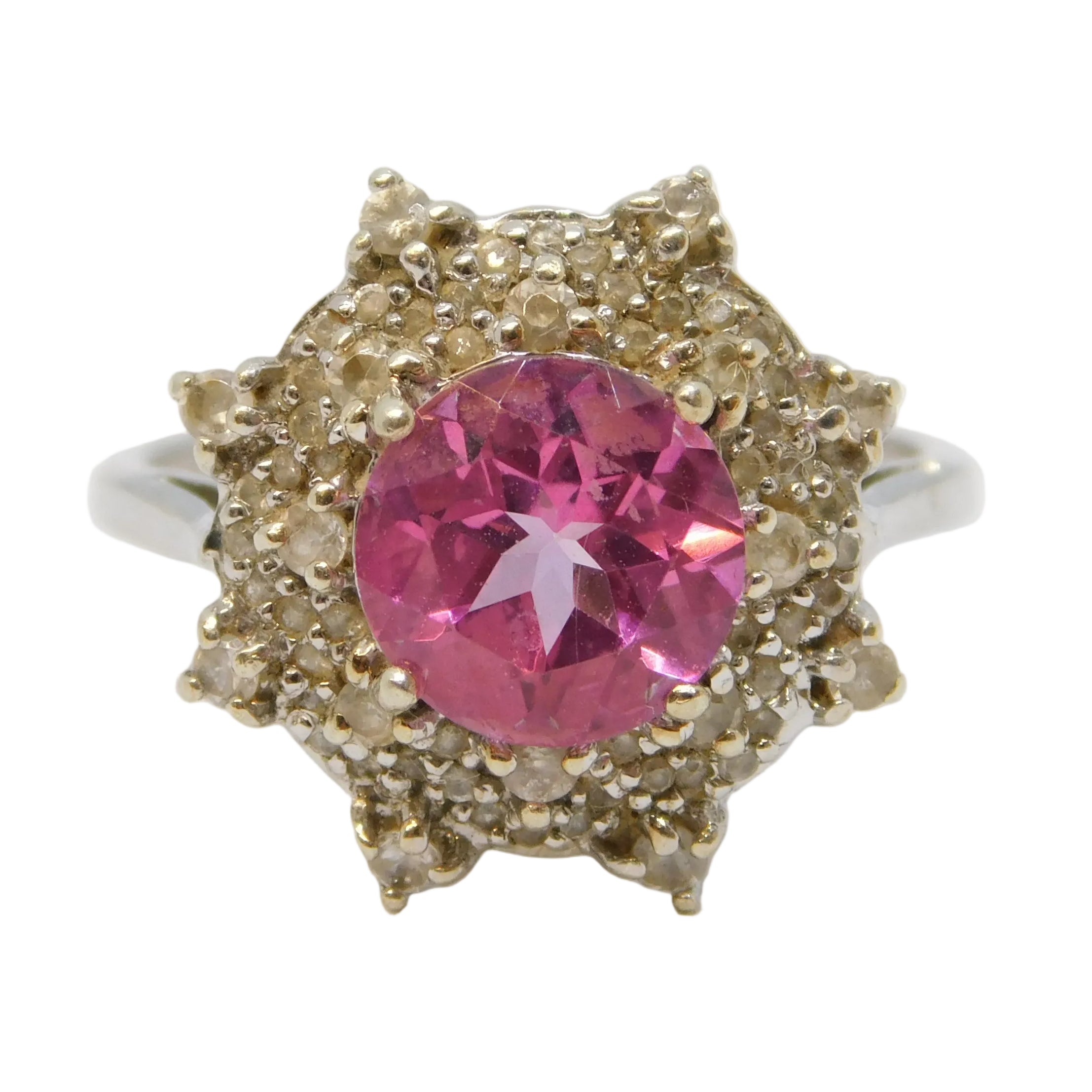 9ct White Gold, Pink & White Sapphire Floral Cluster Ring Vintage Birmingham