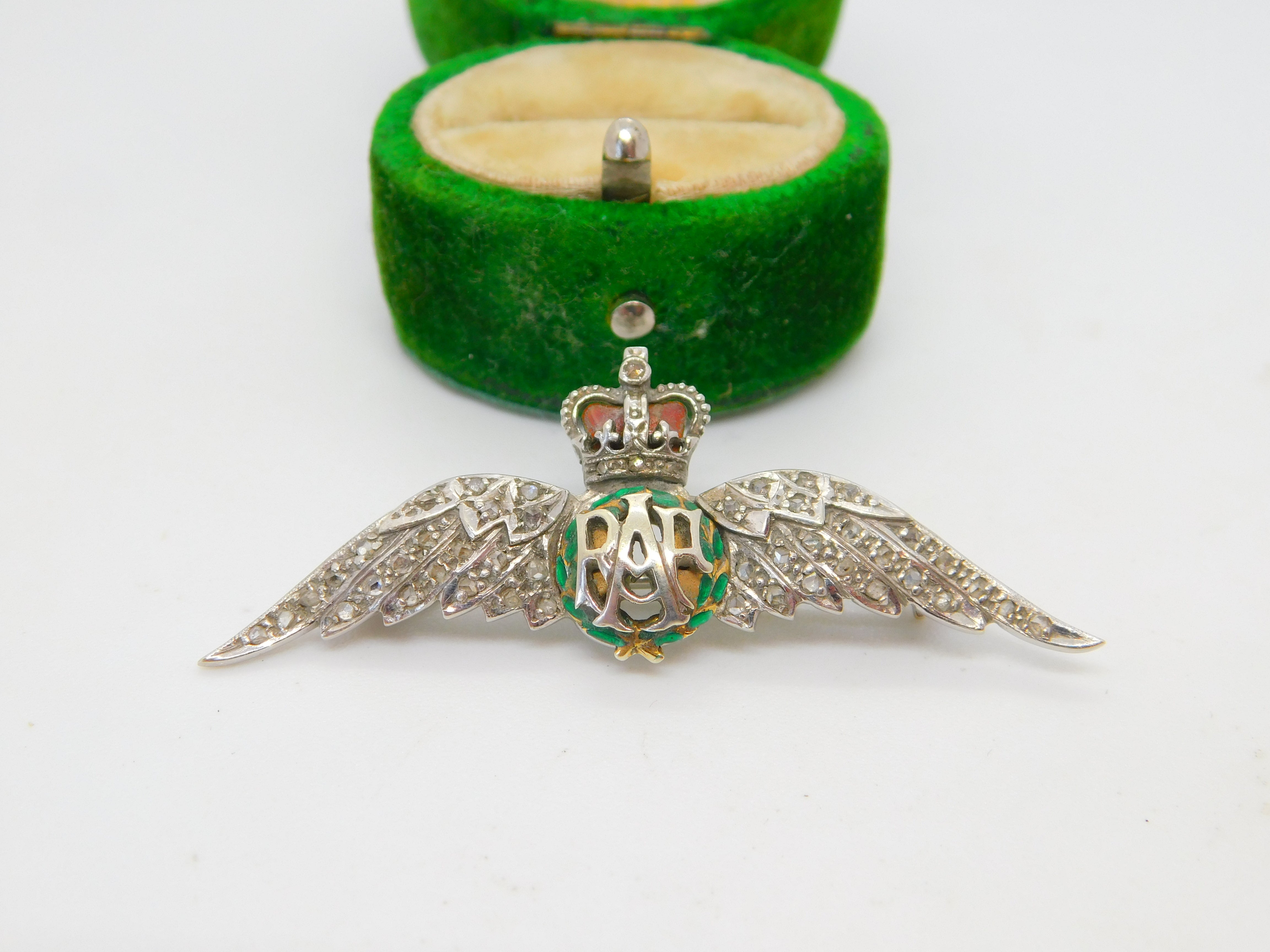 9ct White Gold, Old-Cut Diamond & Enamel RAF Sweetheart Brooch 1956 Vintage