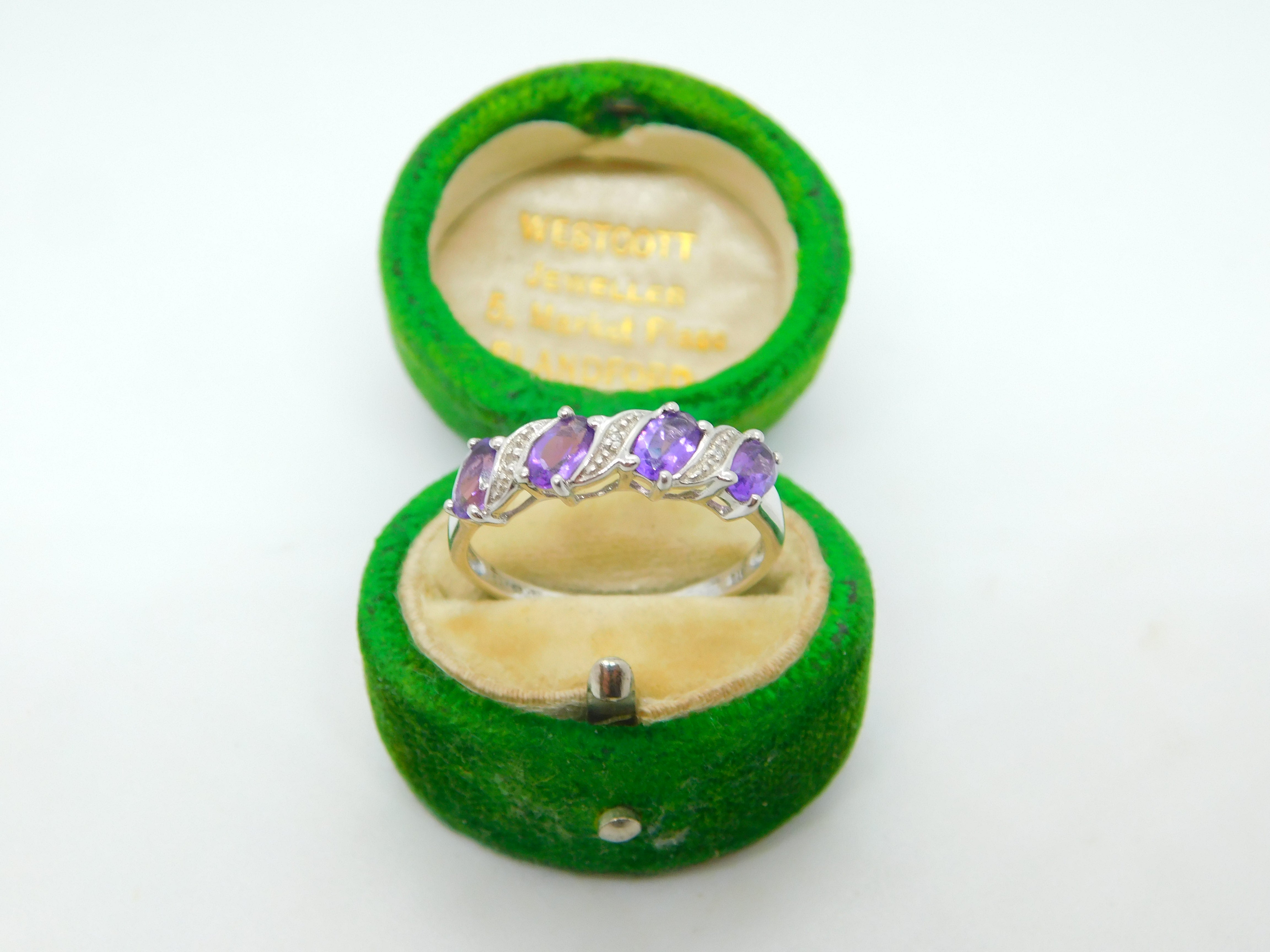 9ct White Gold, Amethyst & Diamond Four-Stone Ring Vintage c1990 Birmingham