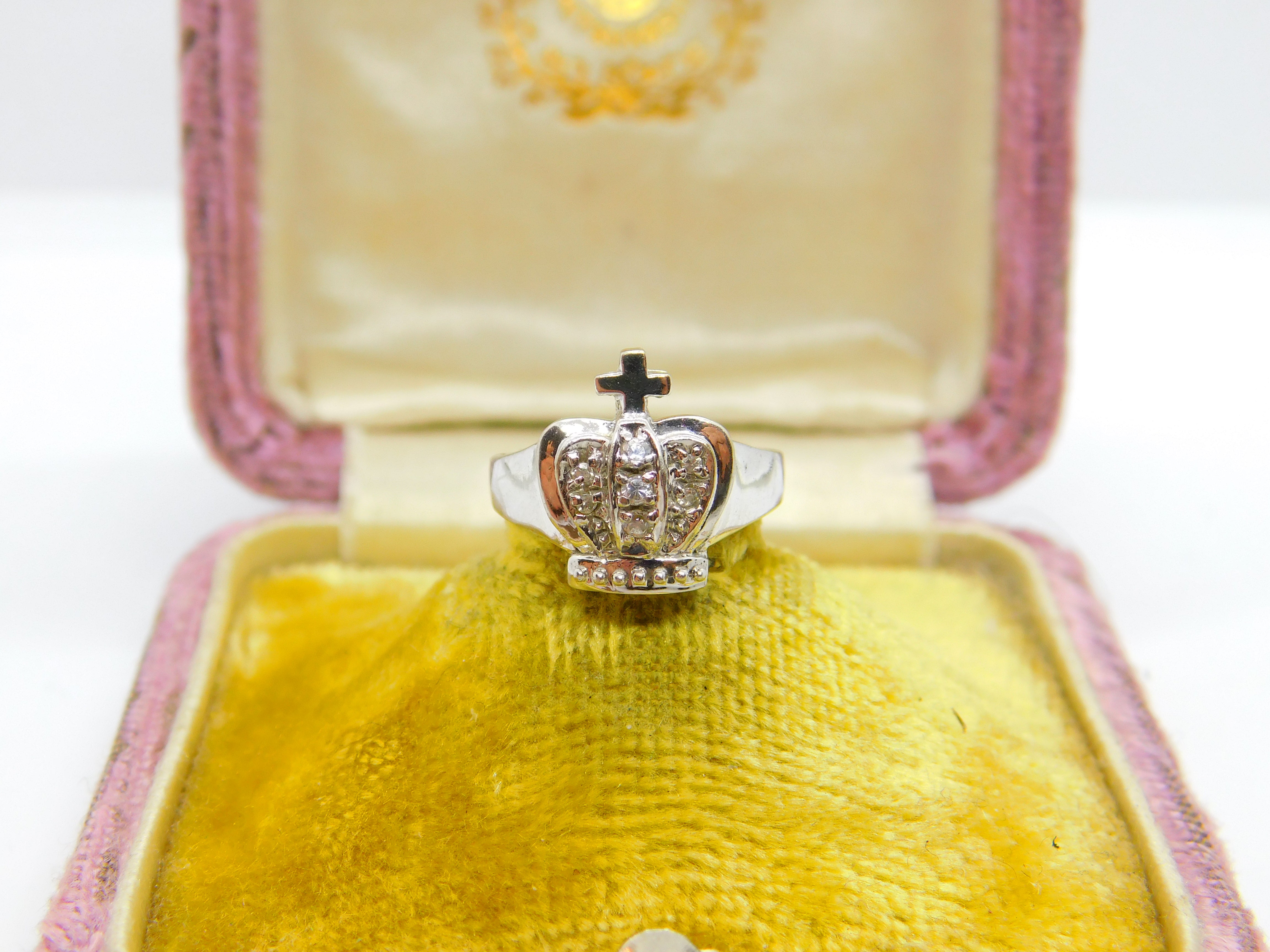 9ct White Gold Spinel Set Royal Crown Band Ring Vintage c2000 Size D 1/2 UK