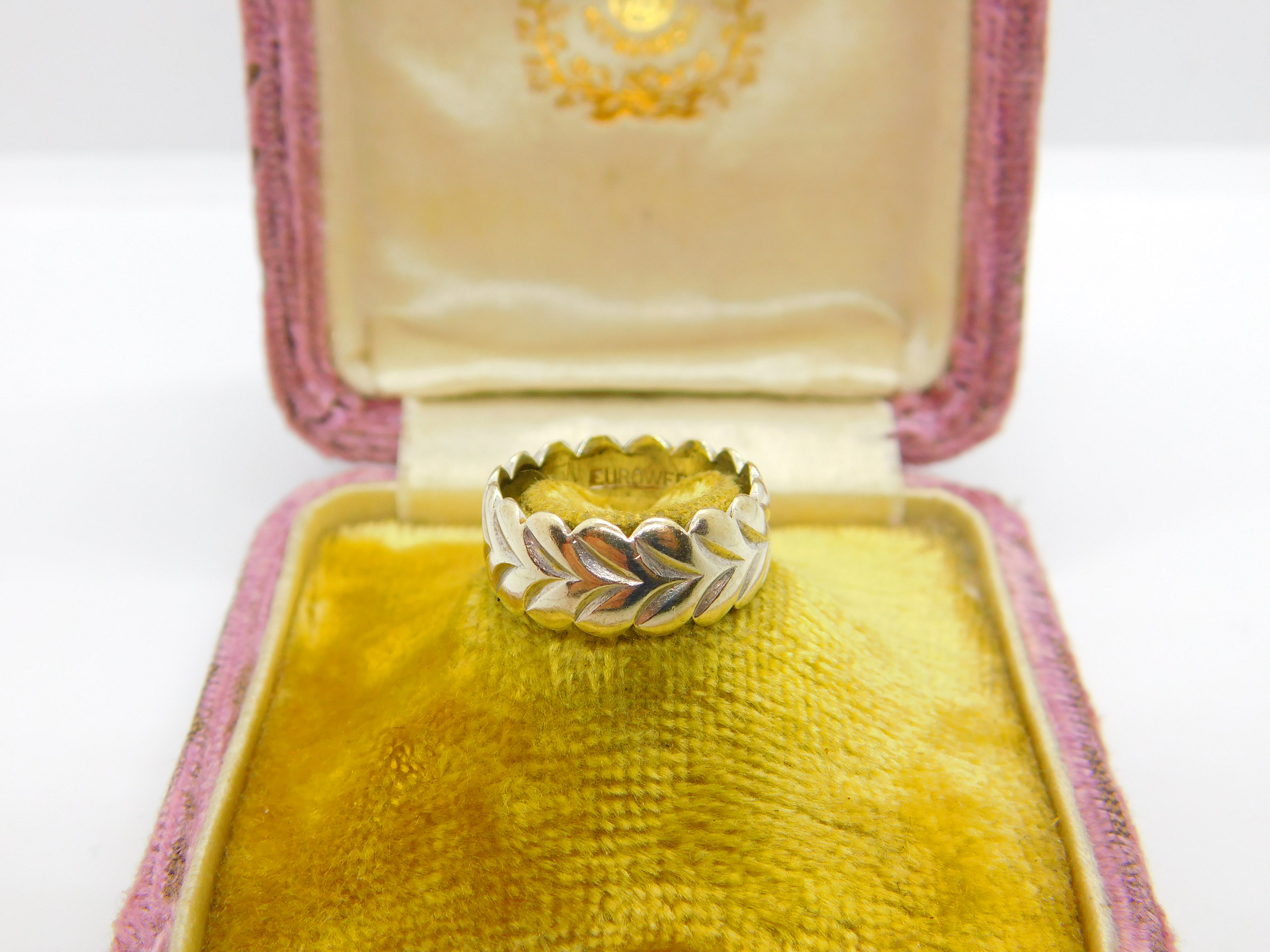 9ct White Gold Woven Leaf Pattern Band Ring London 1970 Vintage Size J UK
