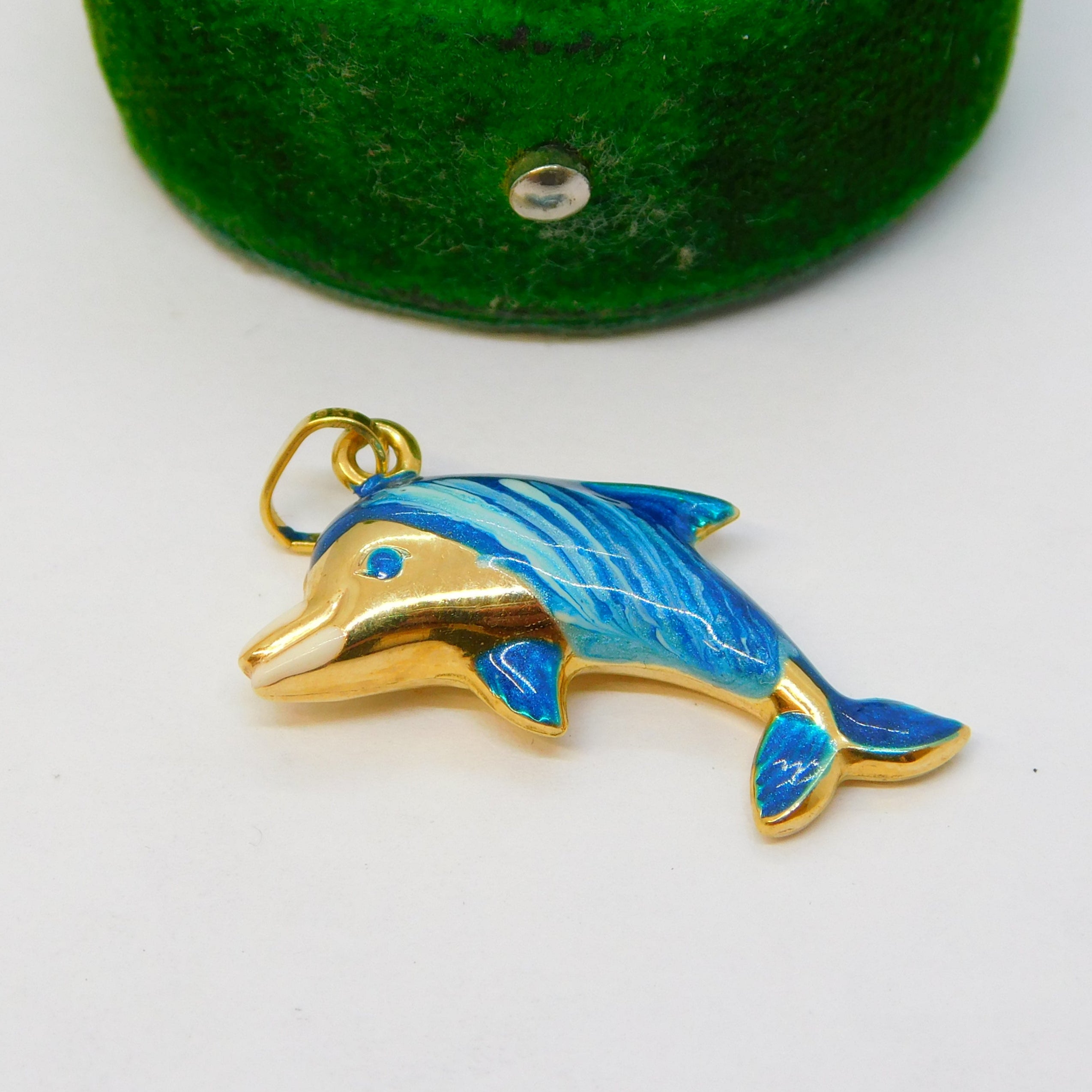 9ct Yellow Gold & Blue Enamel Leaping Dolphin Charm Pendant Vintage c1990