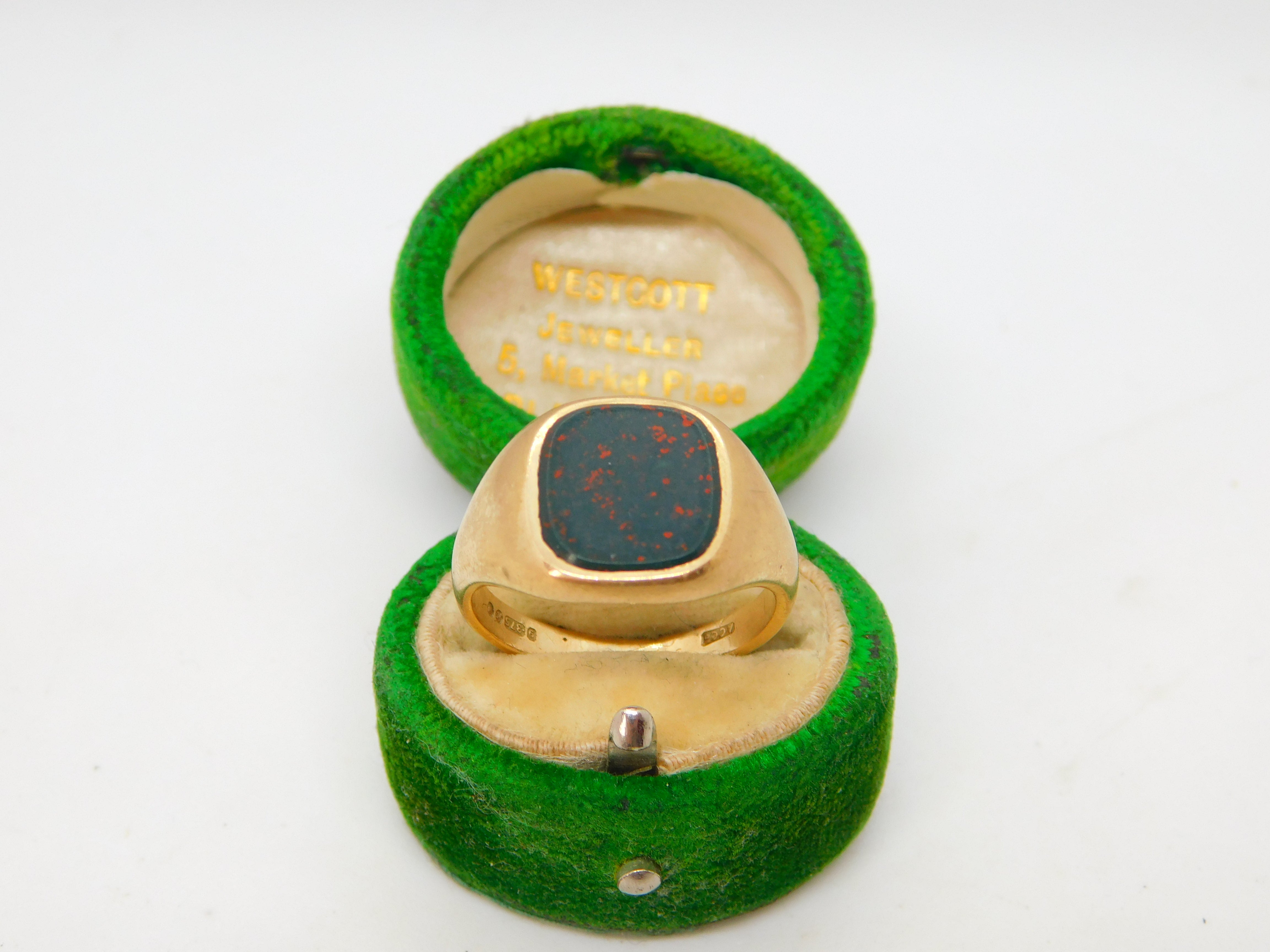 9ct Yellow Gold & Bloodstone Set Signet Ring Vintage 1965 London