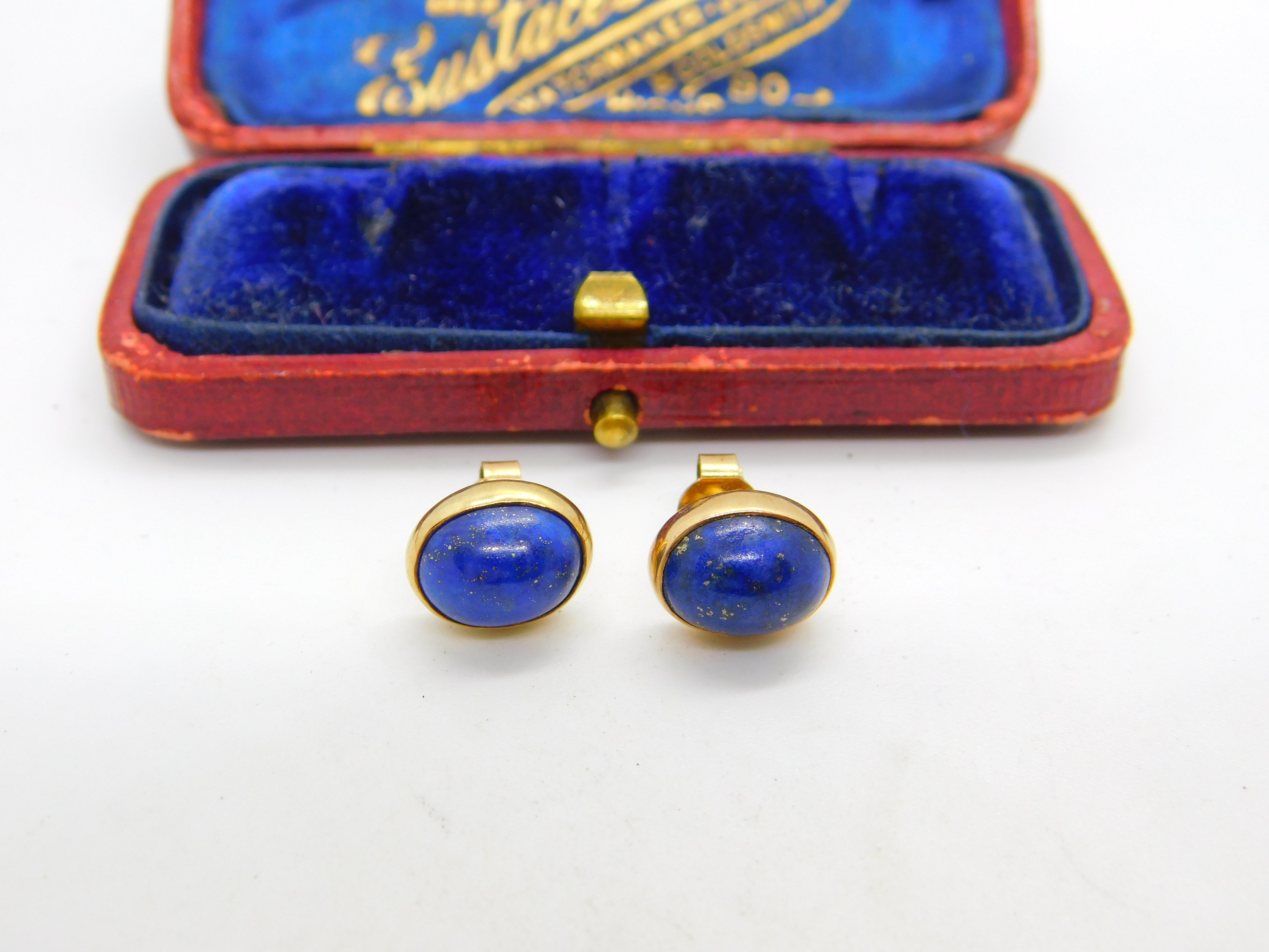 9ct Yellow Gold & Cabochon Lapis Lazuli Set Stud Earrings Vintage c1970