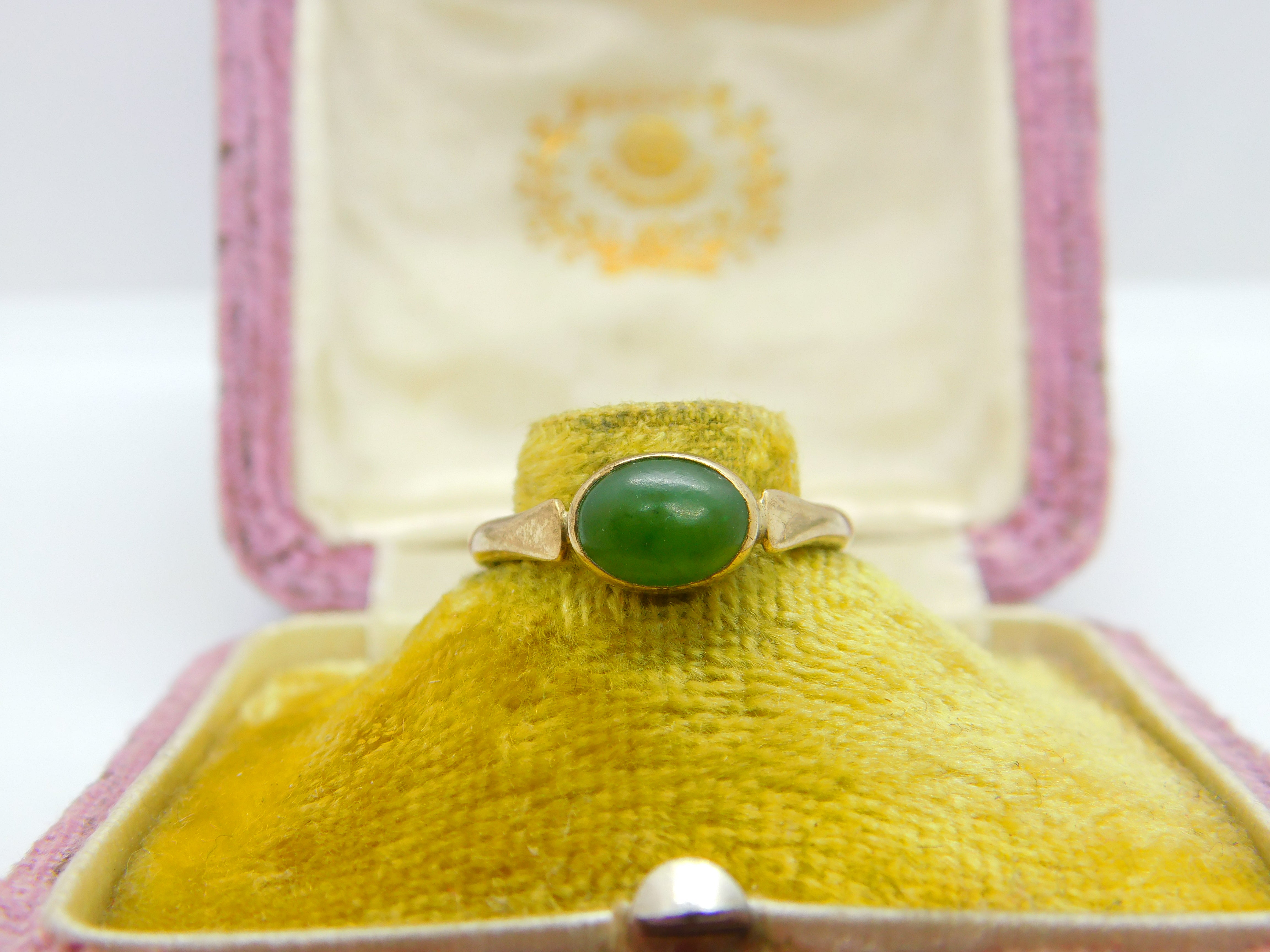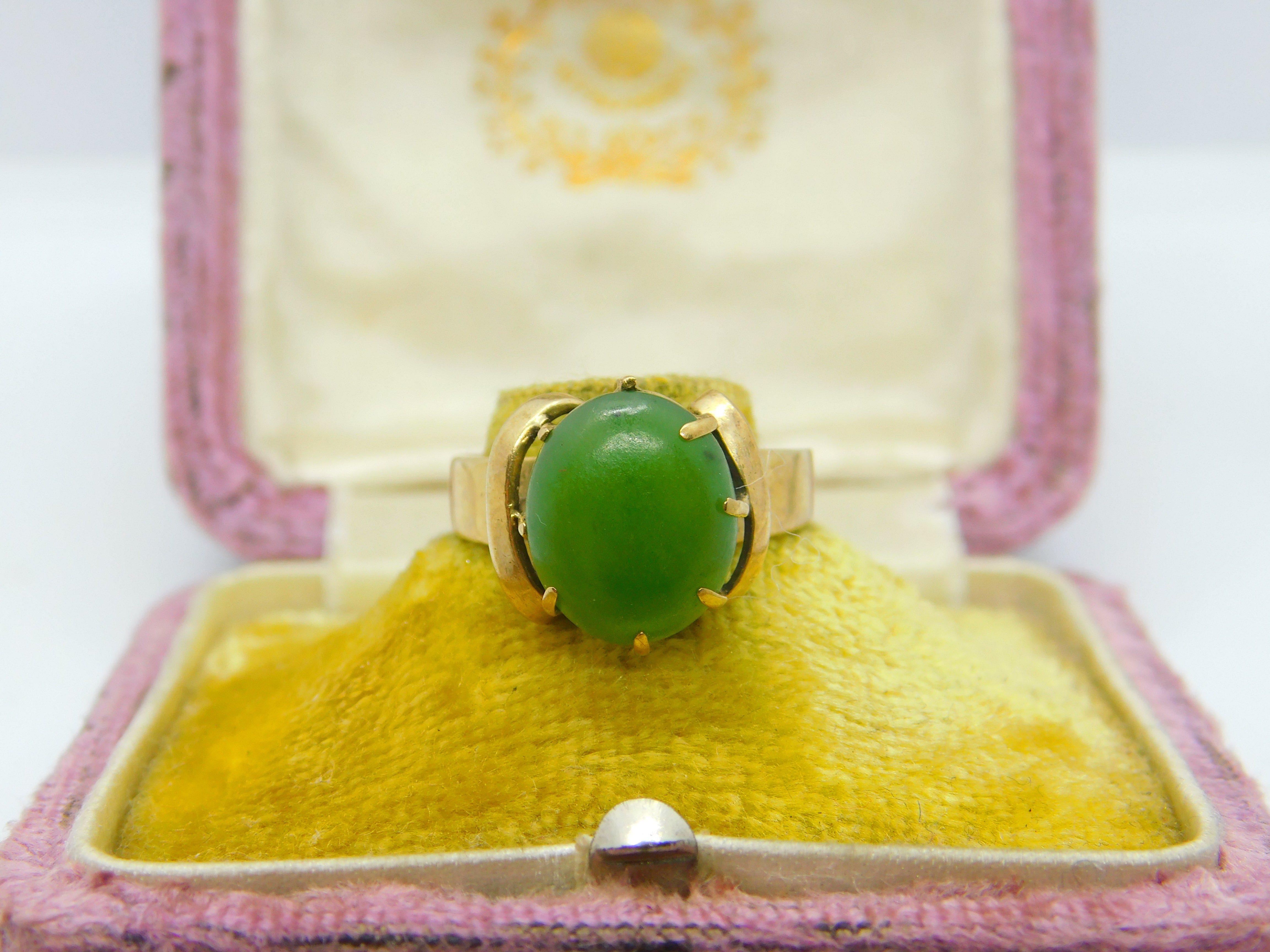 9ct Yellow Gold & Cabochon Green Jade Signet Ring Antique c1940 Art Deco