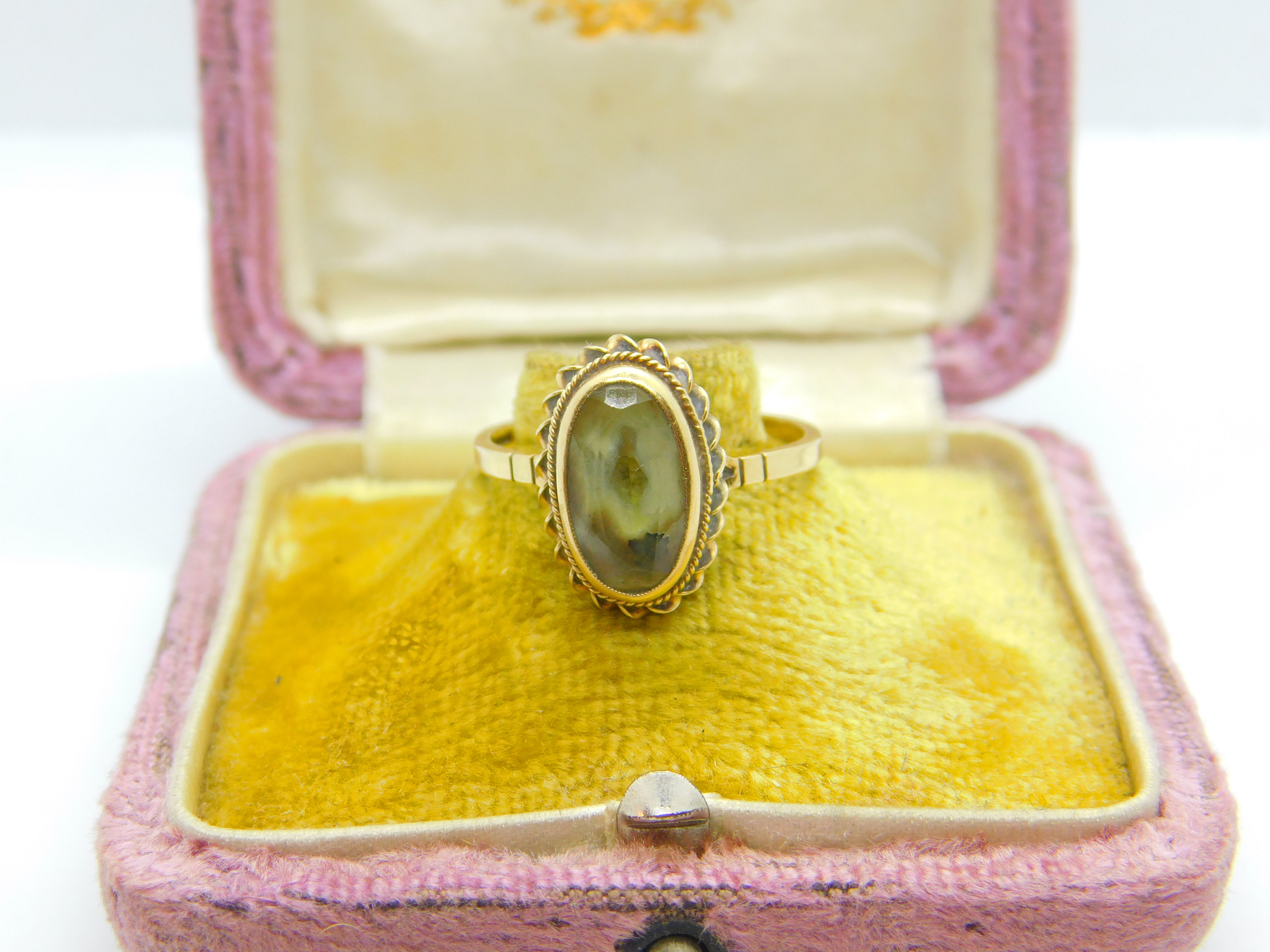 9ct Yellow Gold & Cabochon Moss Agate Signet Ring Vintage c1960 Size O UK