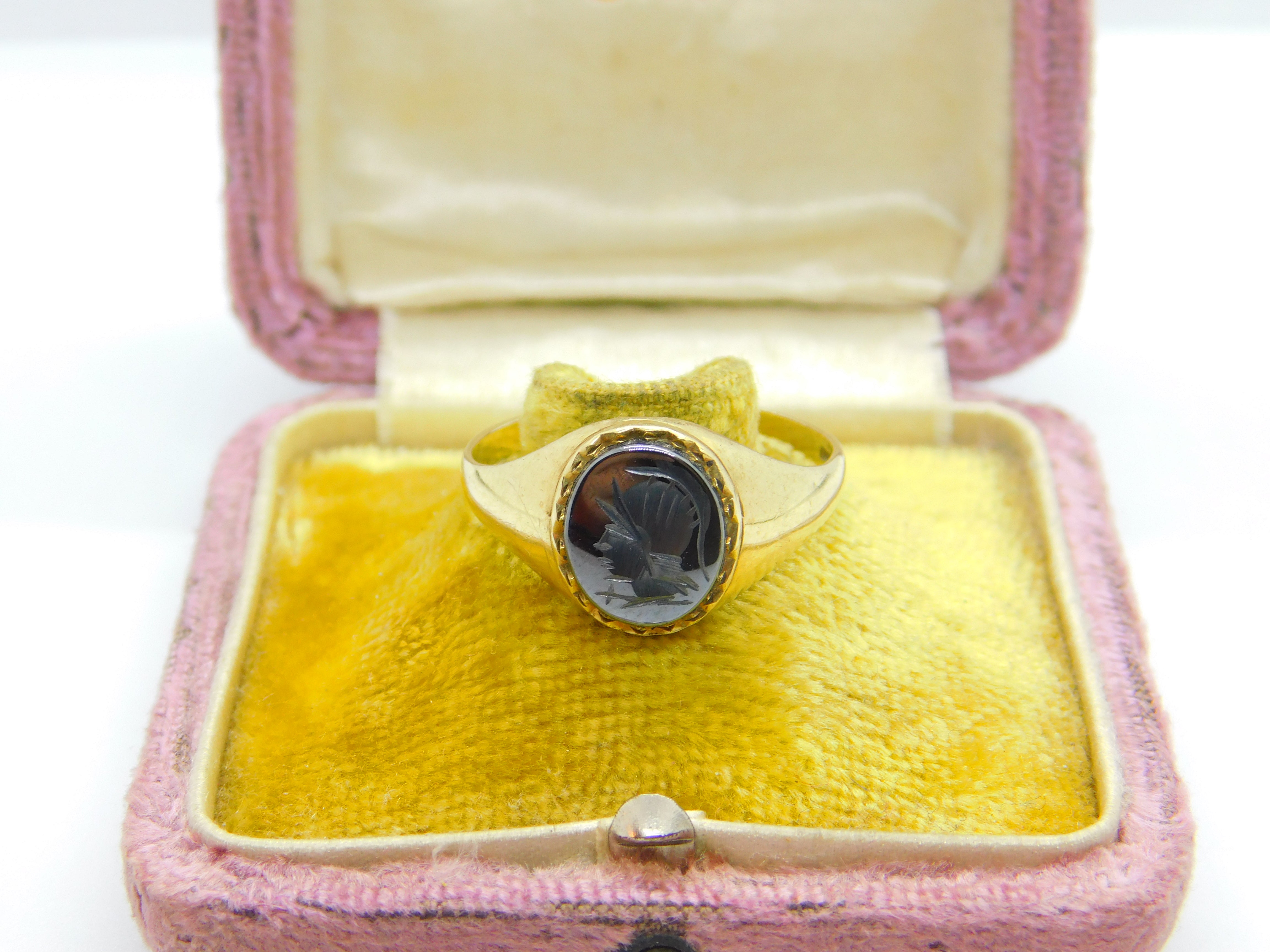 9ct Yellow Gold & Carved Haematite Centurion Intaglio Signet Ring 1990 Birmingha