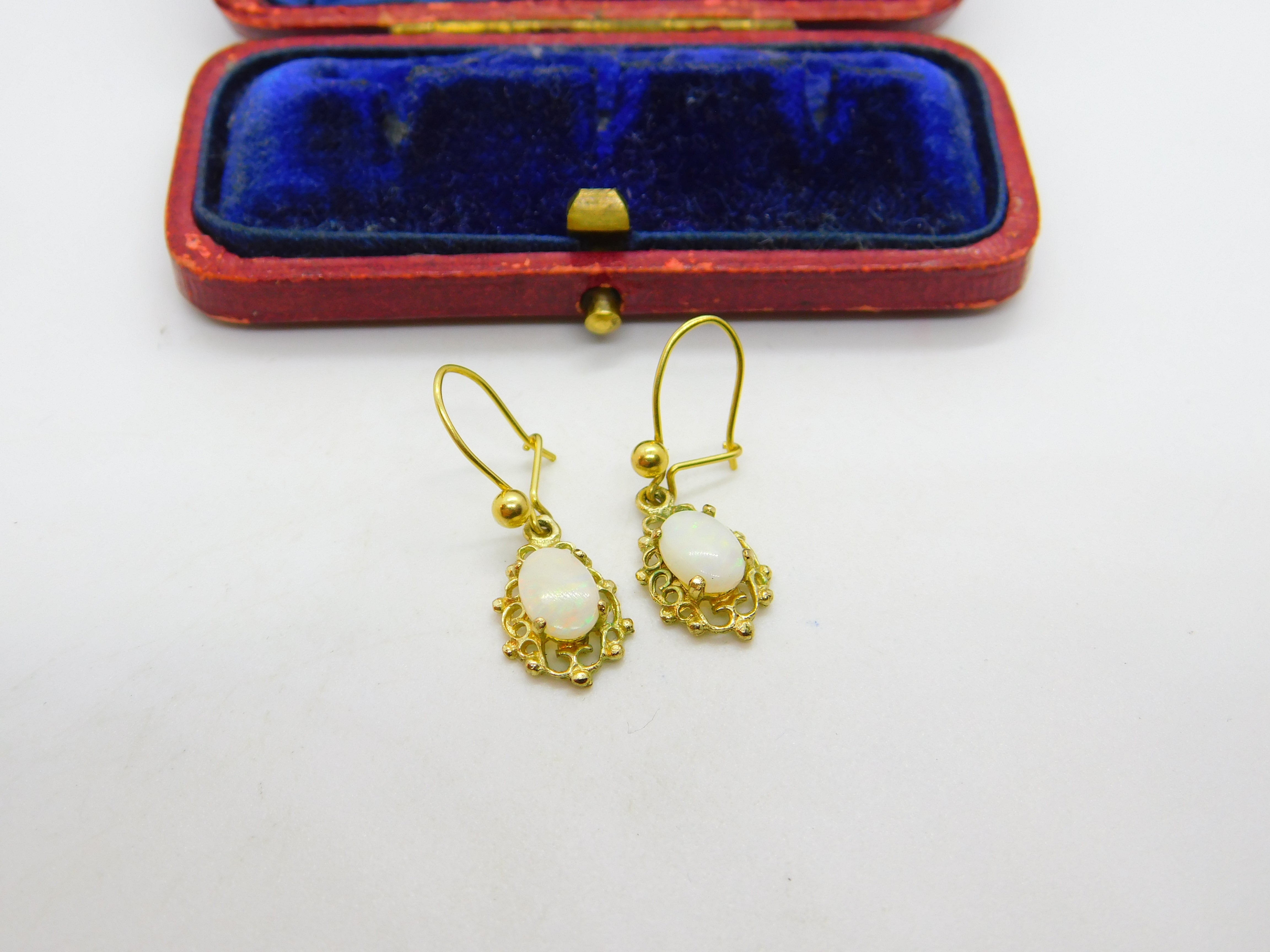9ct Yellow Gold & Cabochon Opal Set Floral Hook Earrings 1979 London Vintage