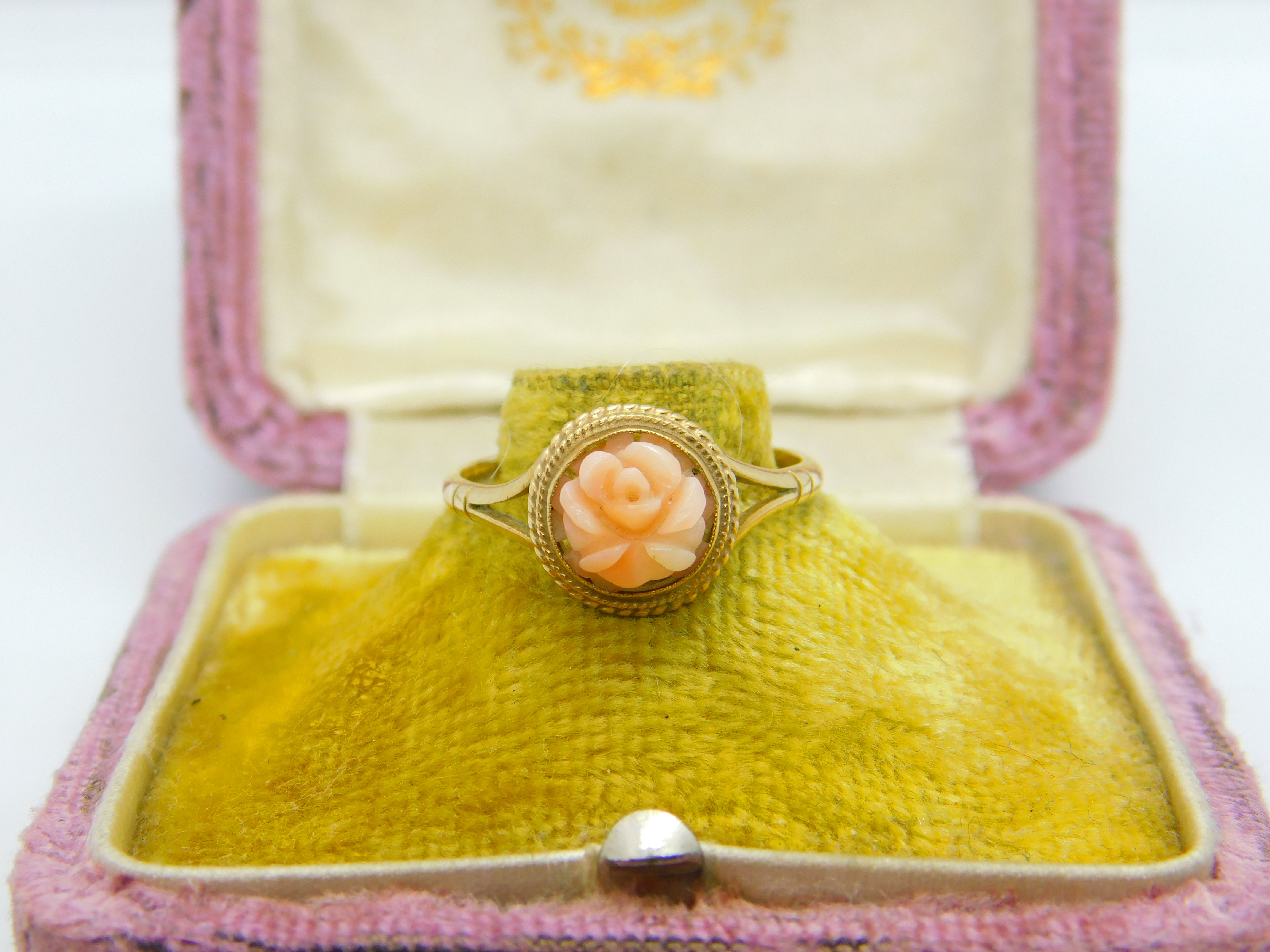 9ct Yellow Gold & Carved Coral Floral Band Ring 1981 Birmingham Vintage