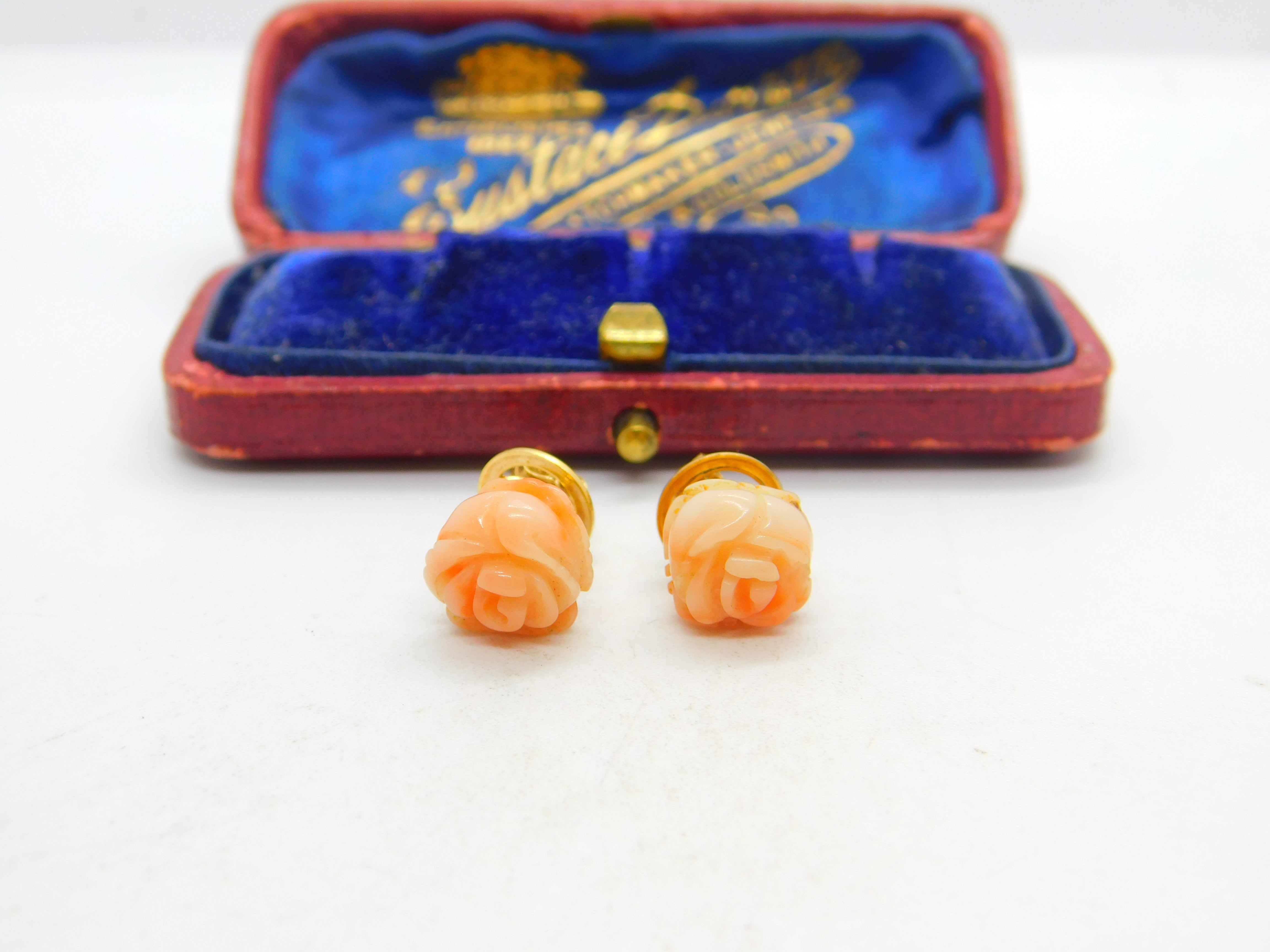 9ct Yellow Gold & Carved Coral Rose Flower Stud Earrings Vintage c1970