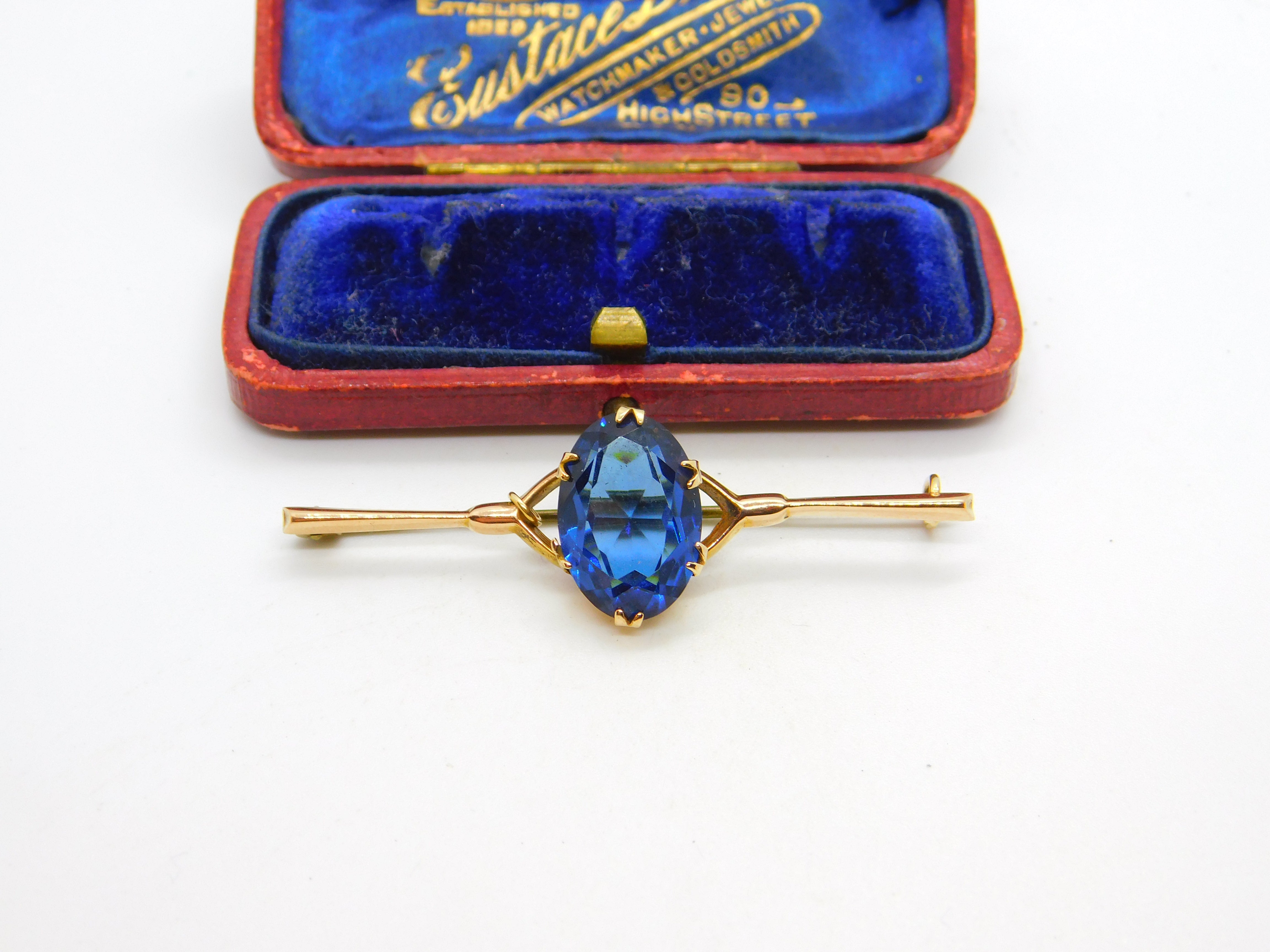 9ct Yellow Gold & Large Blue Topaz Bar Brooch Antique c1920 Art Deco