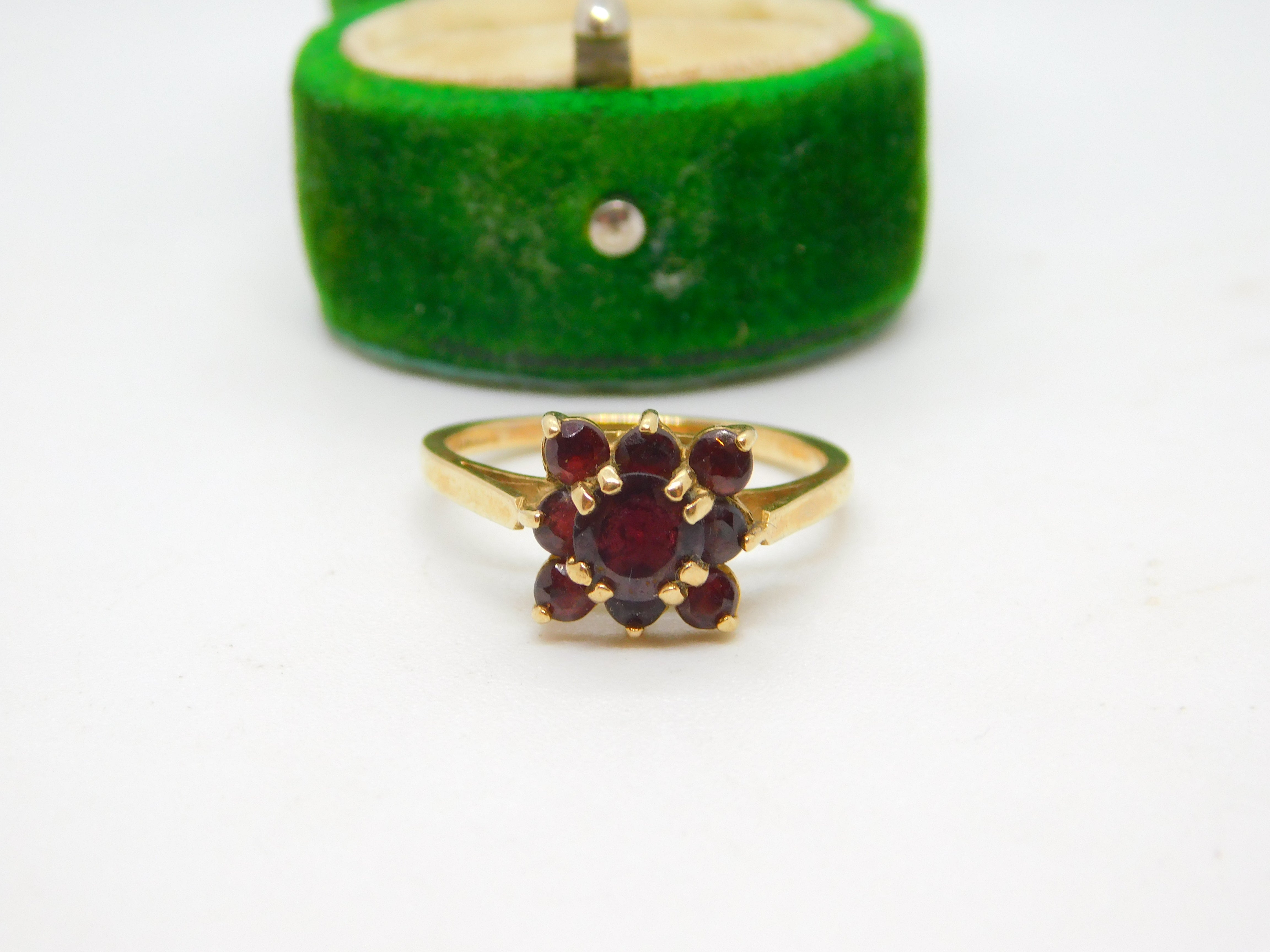 9ct Yellow Gold & Garnet Set Floral Cluster Ring Vintage c1970
