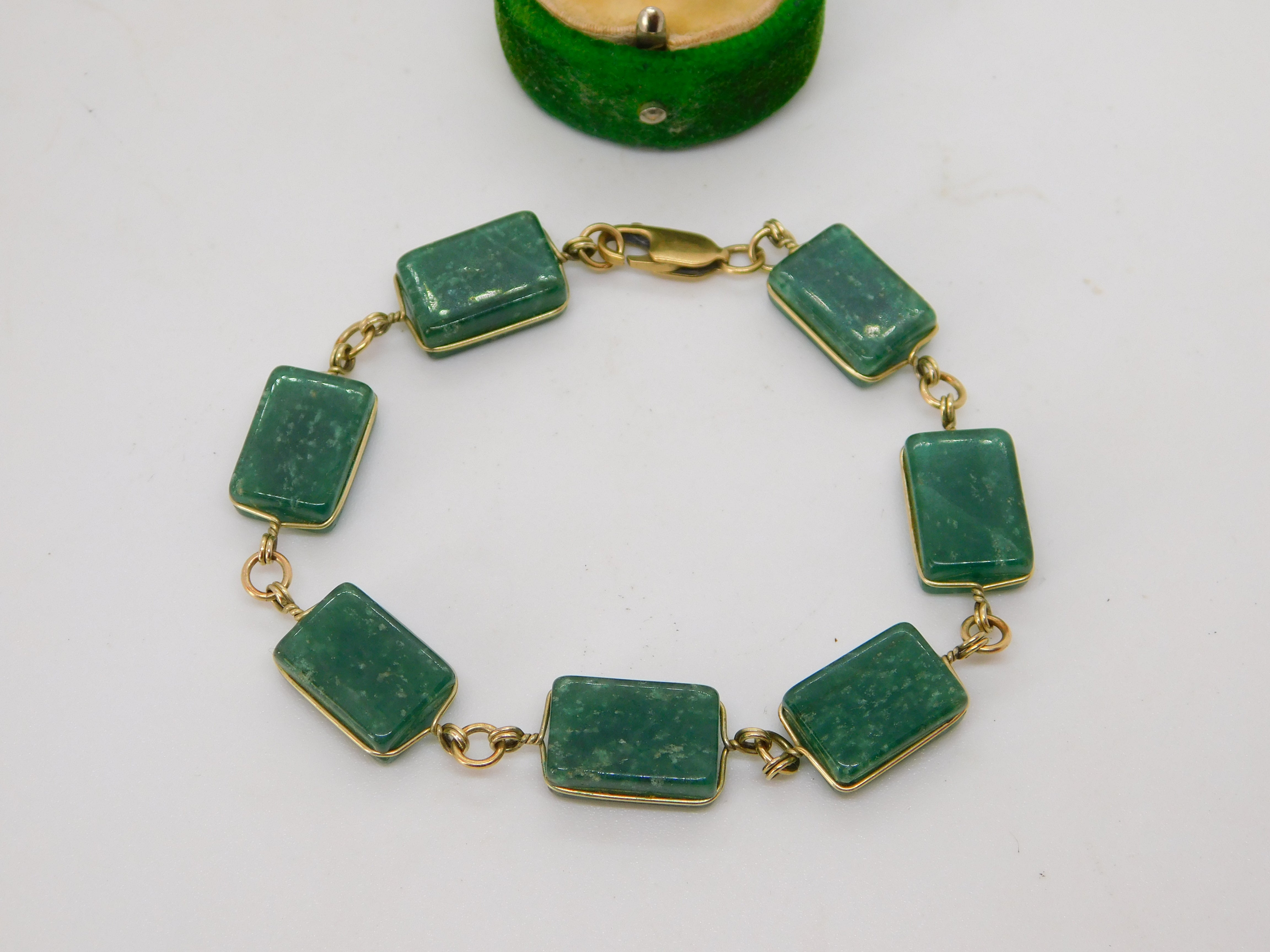 9ct Yellow Gold & Green Hardstone Panel Bracelet Vintage c1970 21cm Length