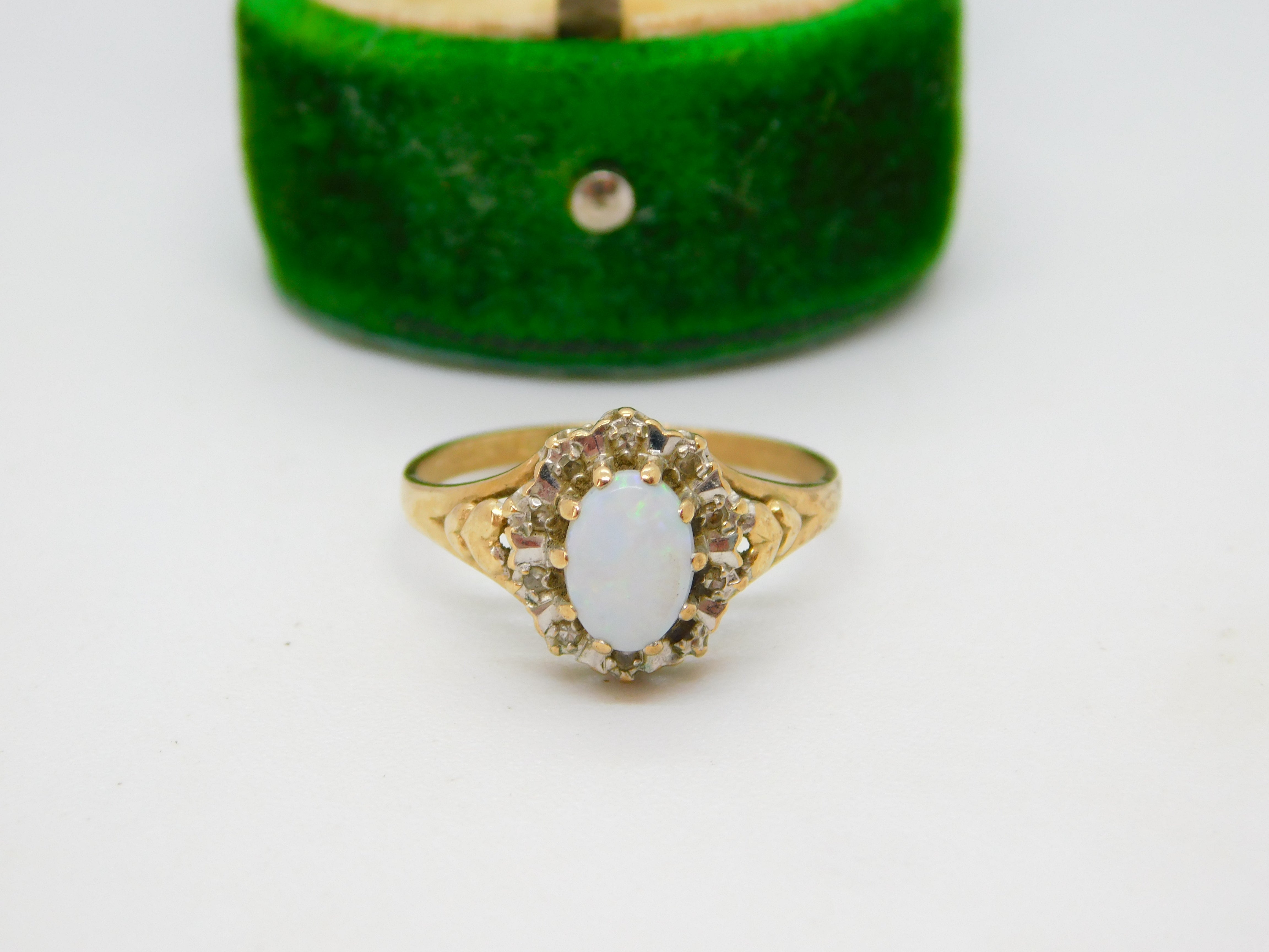 9ct Yellow Gold Cabochon Opal & Diamond Floral Cluster Ring Vintage 1987