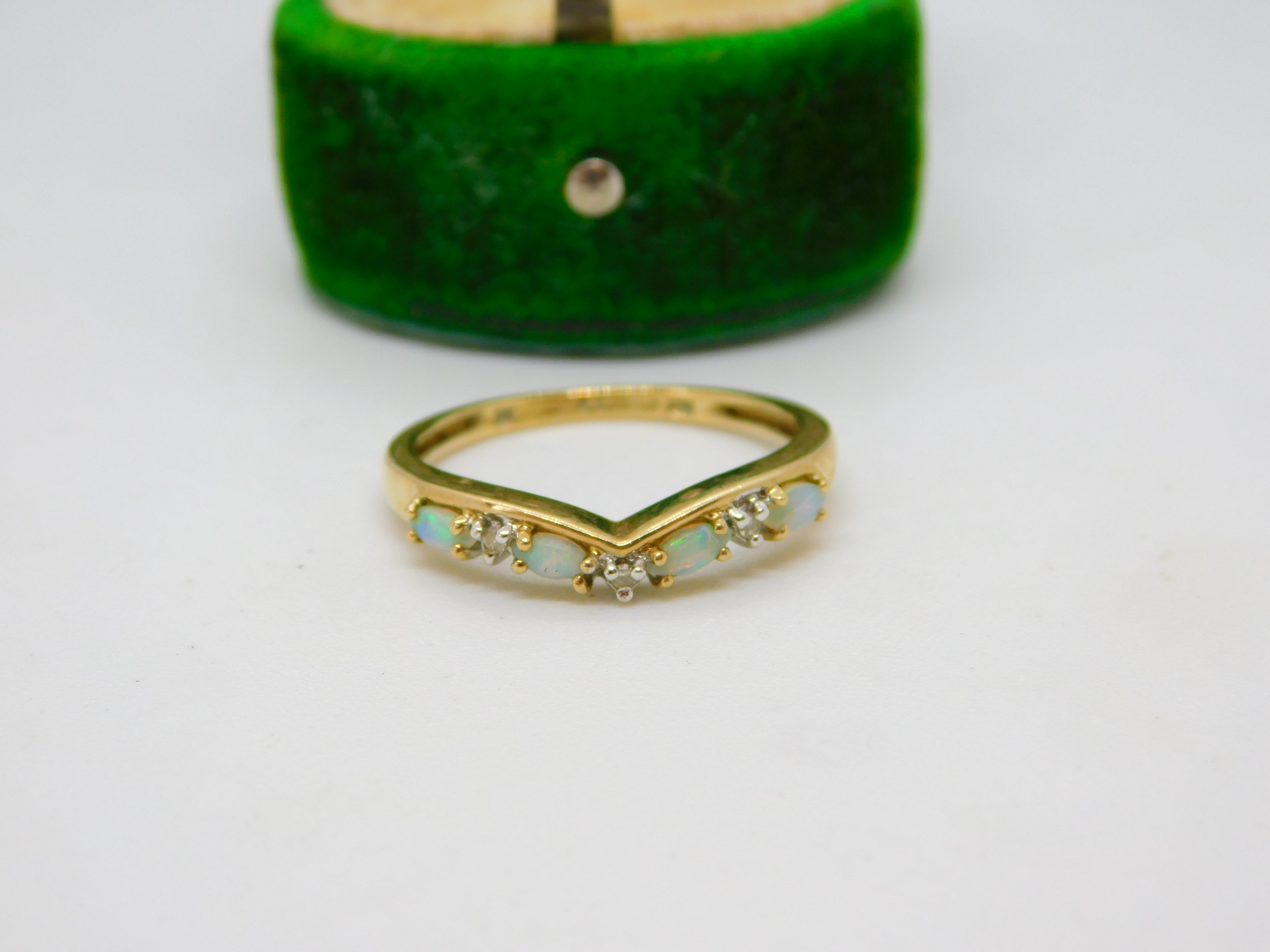 9ct Yellow Gold Cabochon Opal & Spinel Set Wishbone Band Ring Vintage c1990