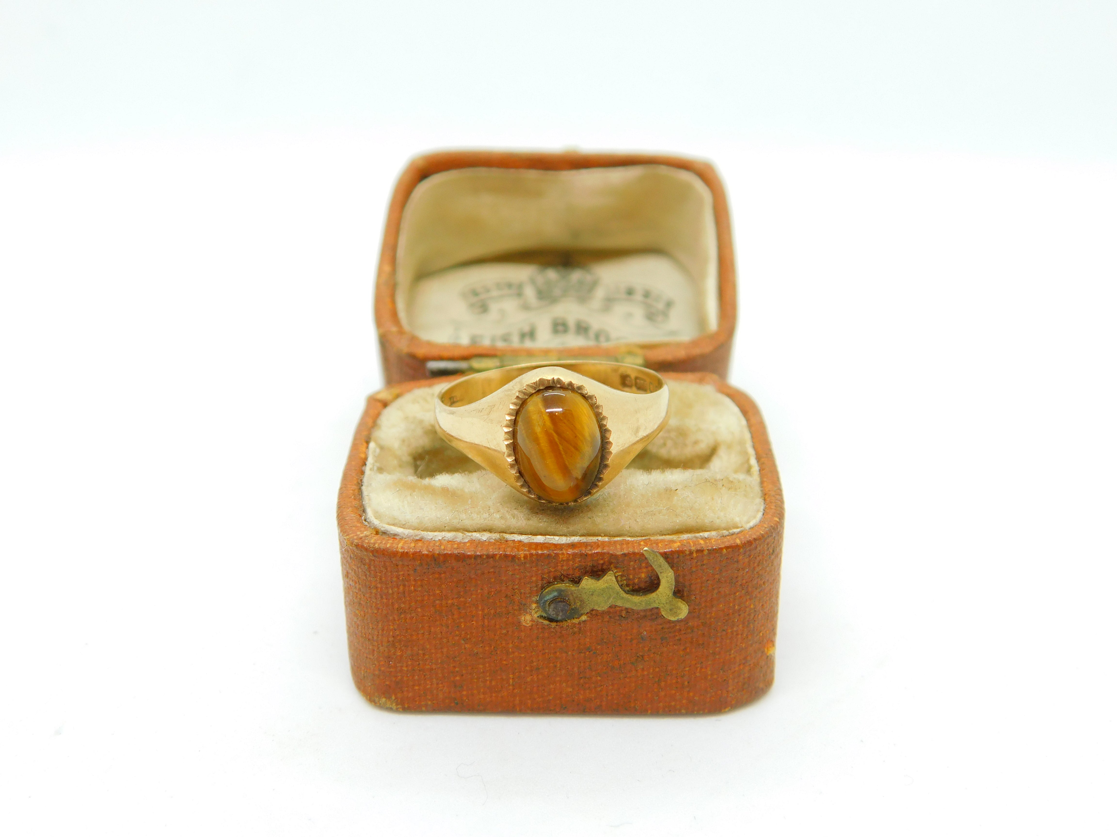 9ct Yellow Gold Cabochon Tiger's Eye Signet Ring Vintage c1950 Size M 1/2 UK