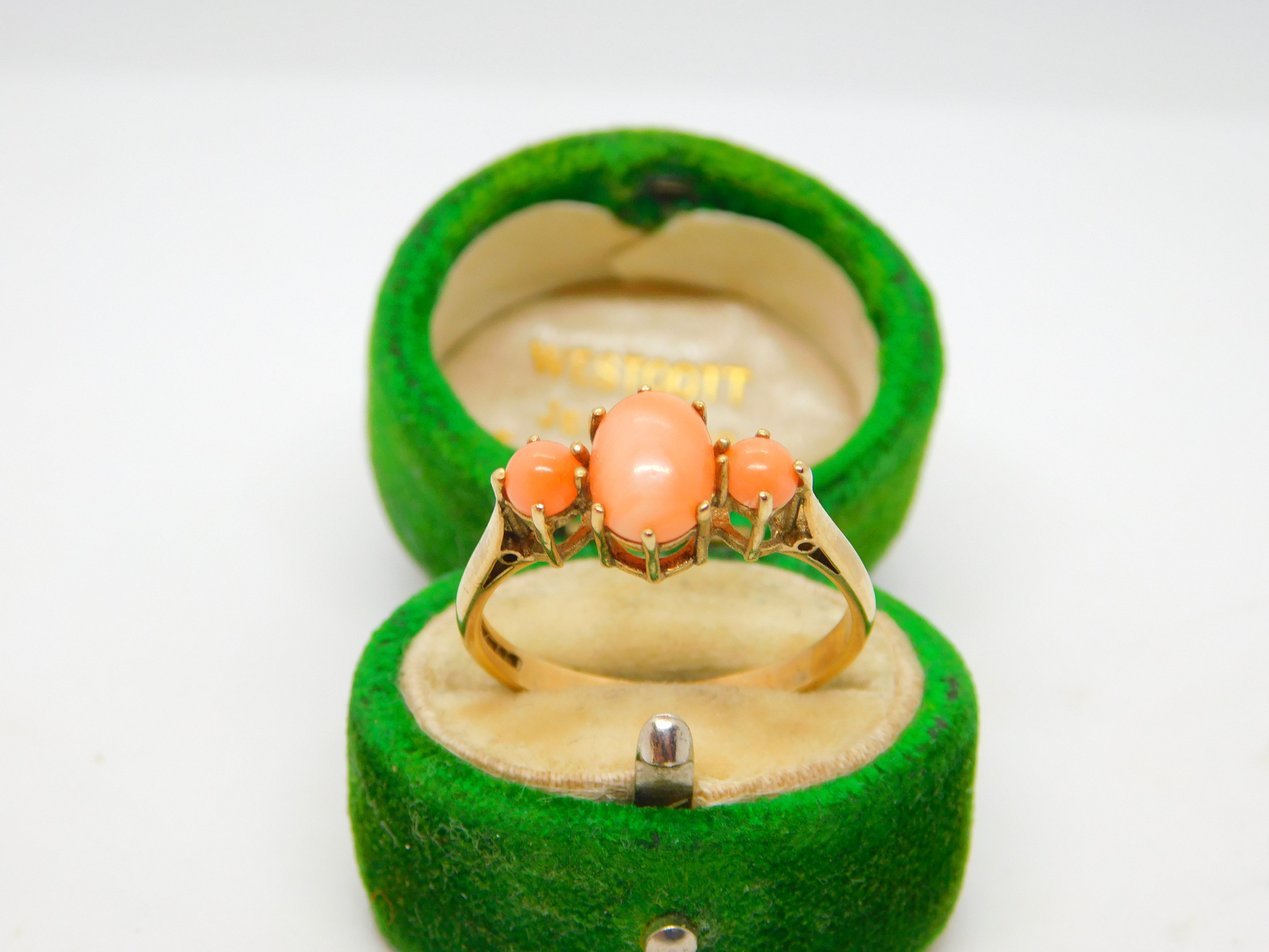 9ct Yellow Gold Cabochon Red Coral Dress Ring Vintage 2007 Birmingham