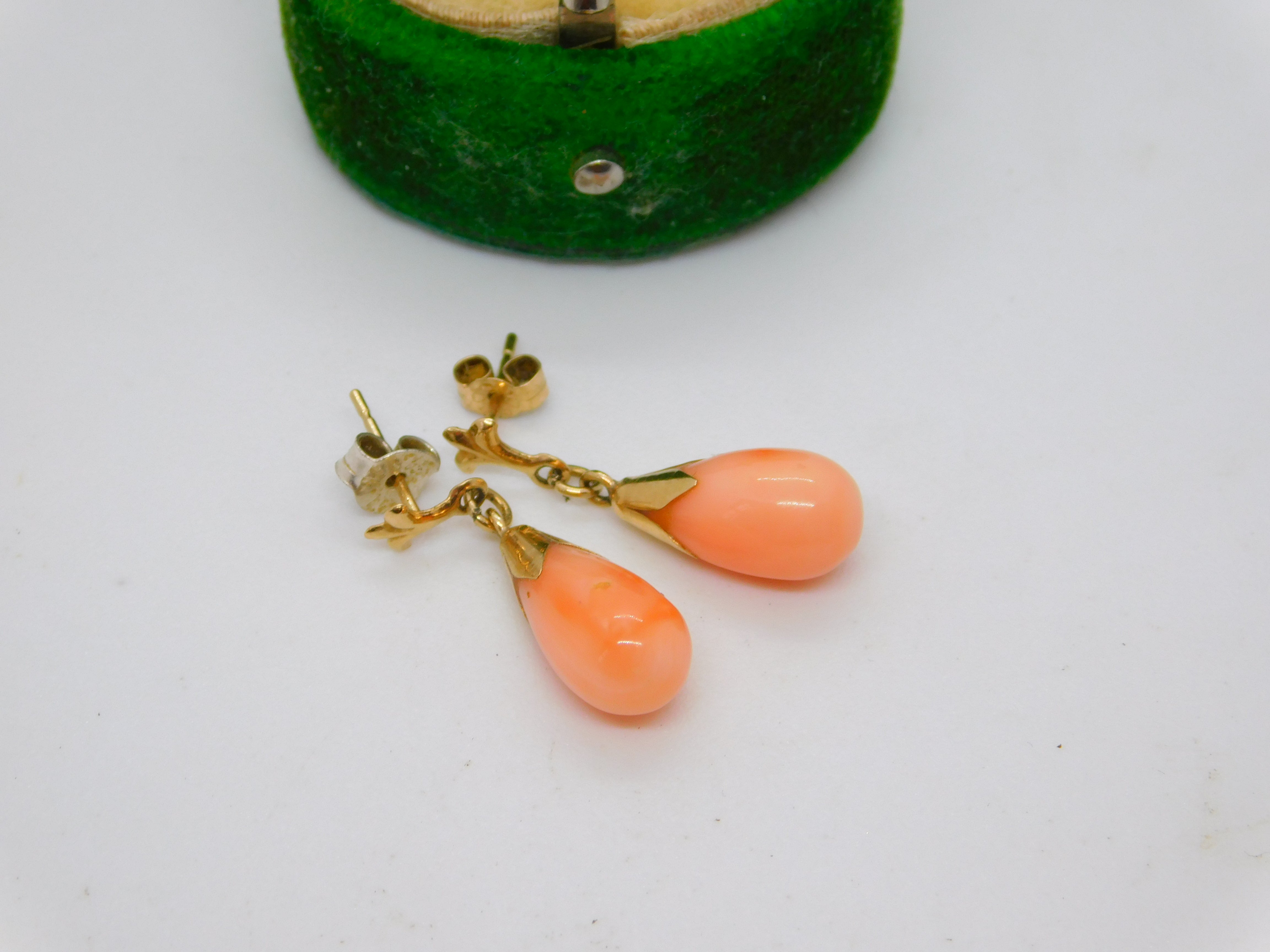 9ct Yellow Gold Cabochon Red Coral Beaded Drop Earrings Vintage c1970