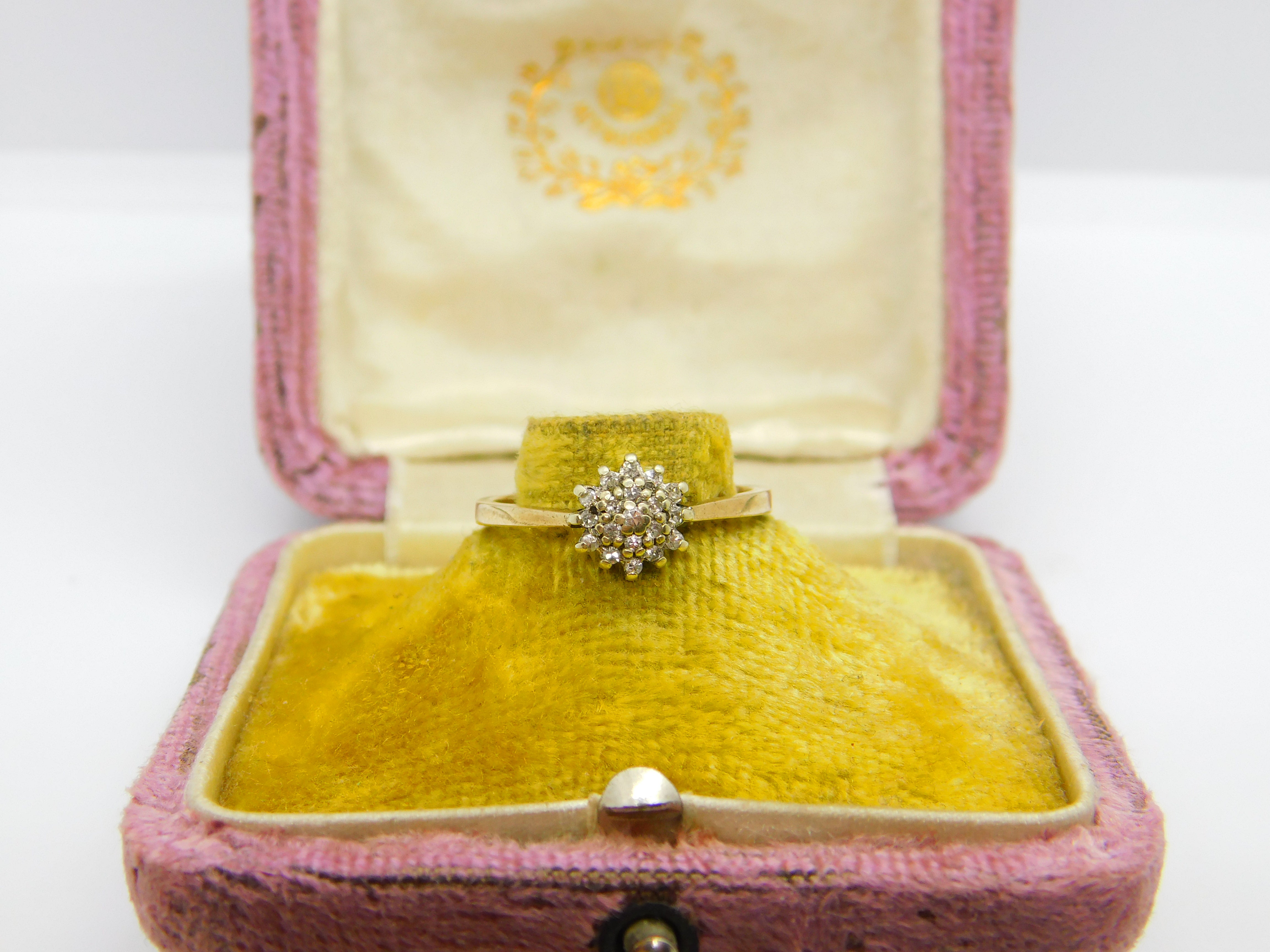 9ct Yellow Gold Diamond Floral Daisy Cluster Ring 1986 Birmingham Vintage