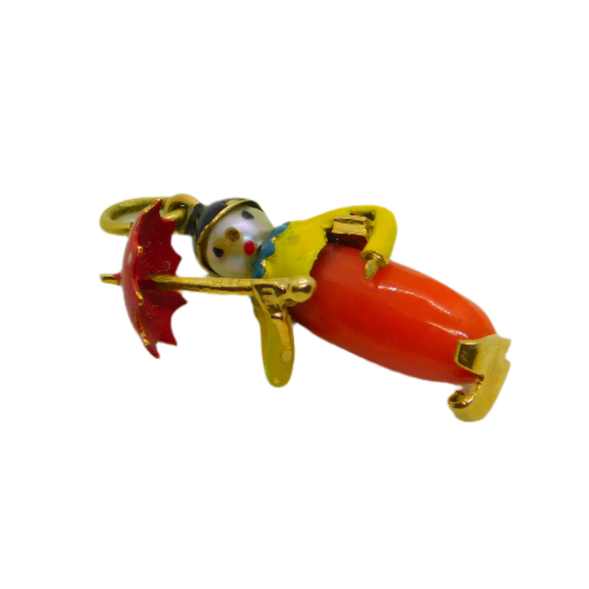 14ct Yellow Gold, Coral & Enamel Lady with Umbrella Charm Vintage c1970