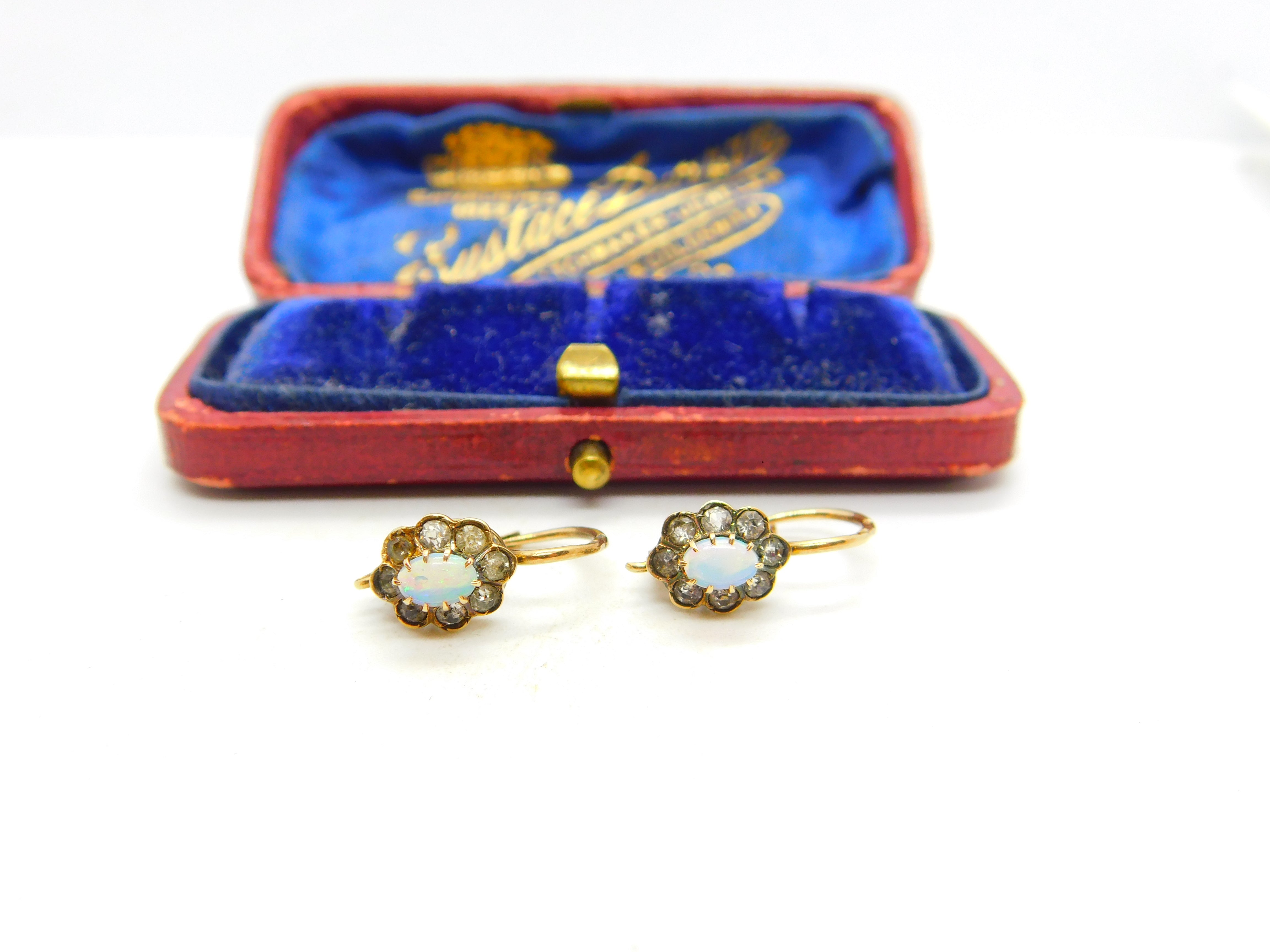 14ct Yellow Gold, Diamond Paste & Cabochon Opal Floral Earrings Antique c1920