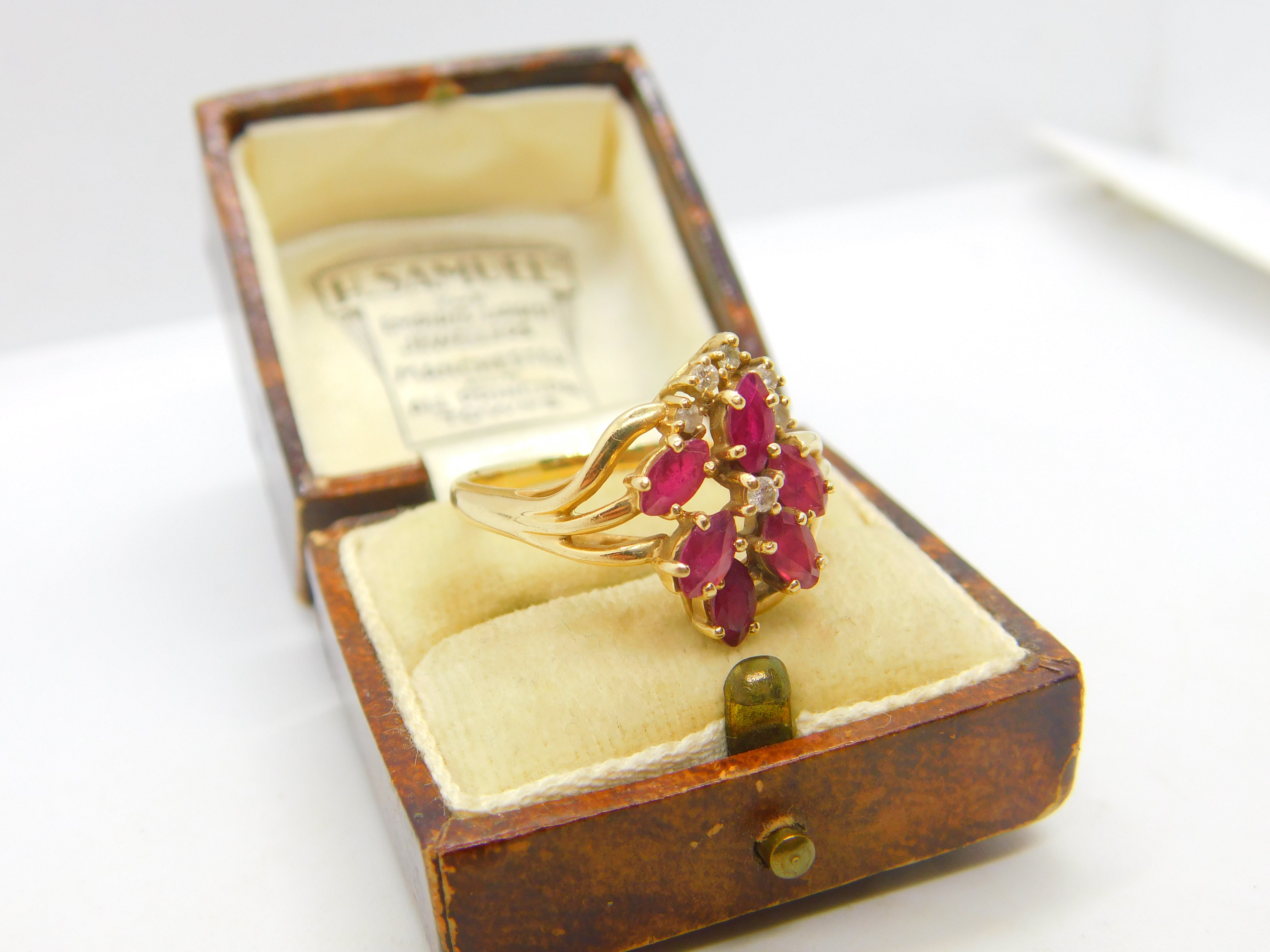 14ct Yellow Gold, Ruby & Diamond Floral Cluster Ring Vintage c1970