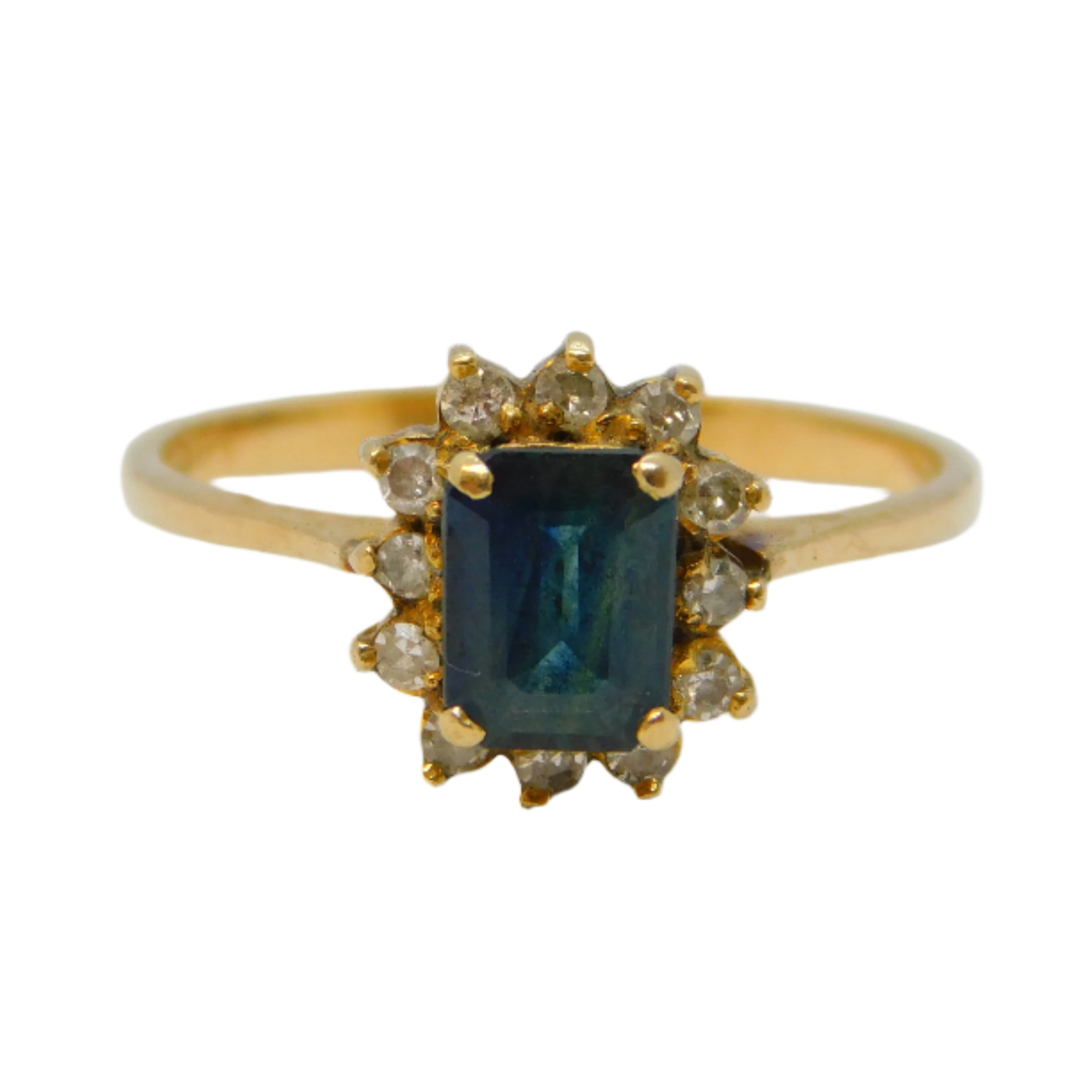 14ct Yellow Gold, 0.5ct Emerald Cut Sapphire & Diamond Engagement Ring Vintage c1970