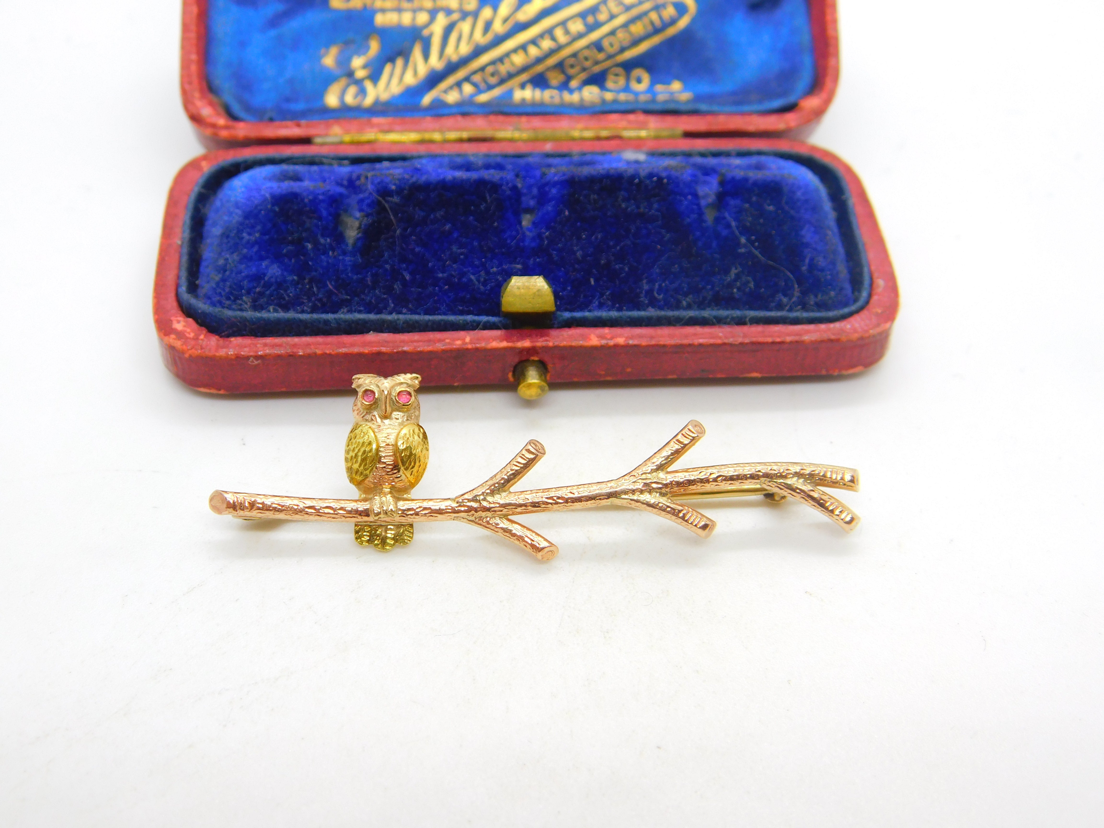 9ct Yellow Gold Owl Perched on Branch Bar Brooch Vintage 1963 Birmingham