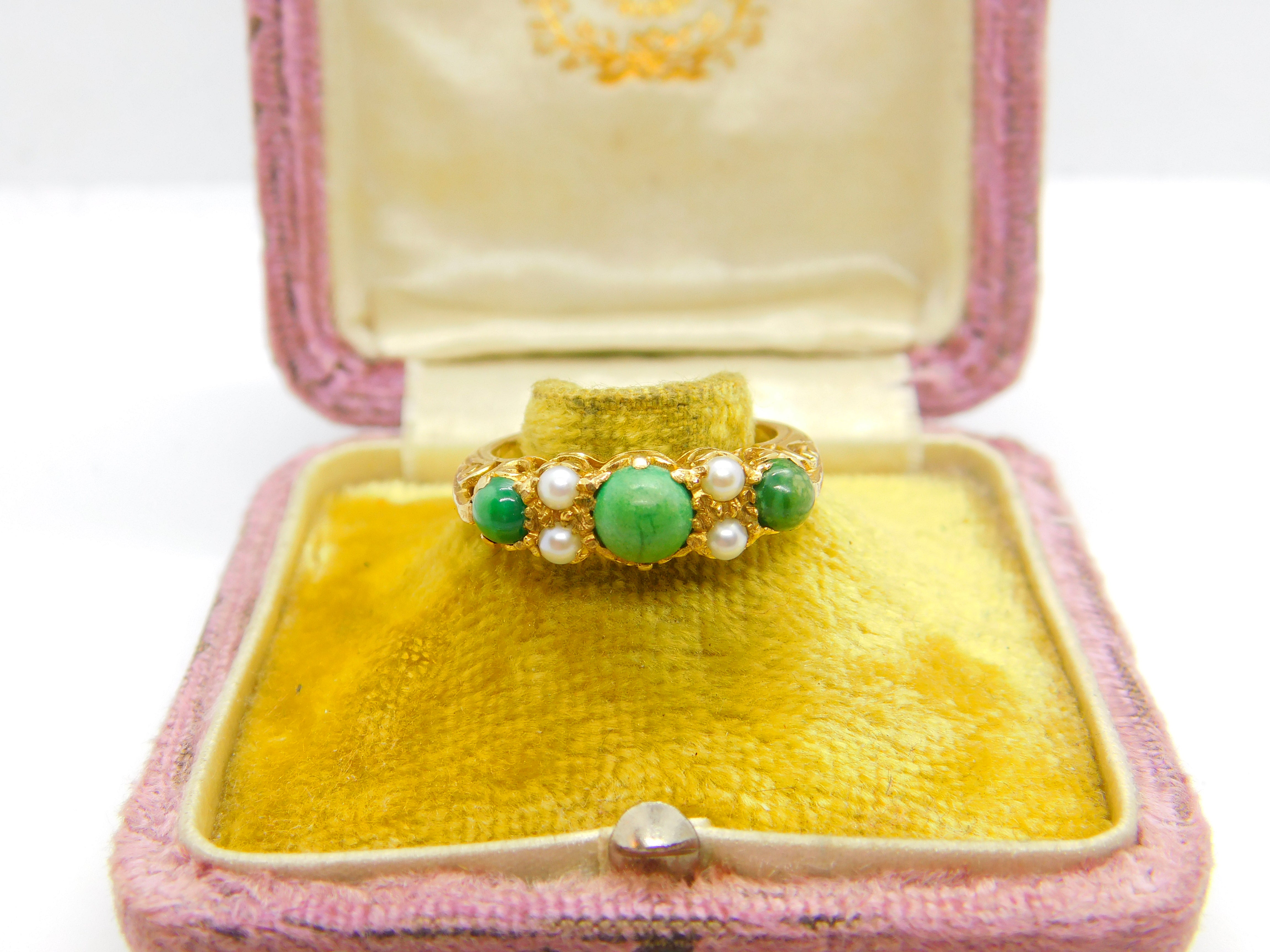 9ct Yellow Gold Ornate Turquoise & Pearl Set Band Ring Antique c1930 Art Deco