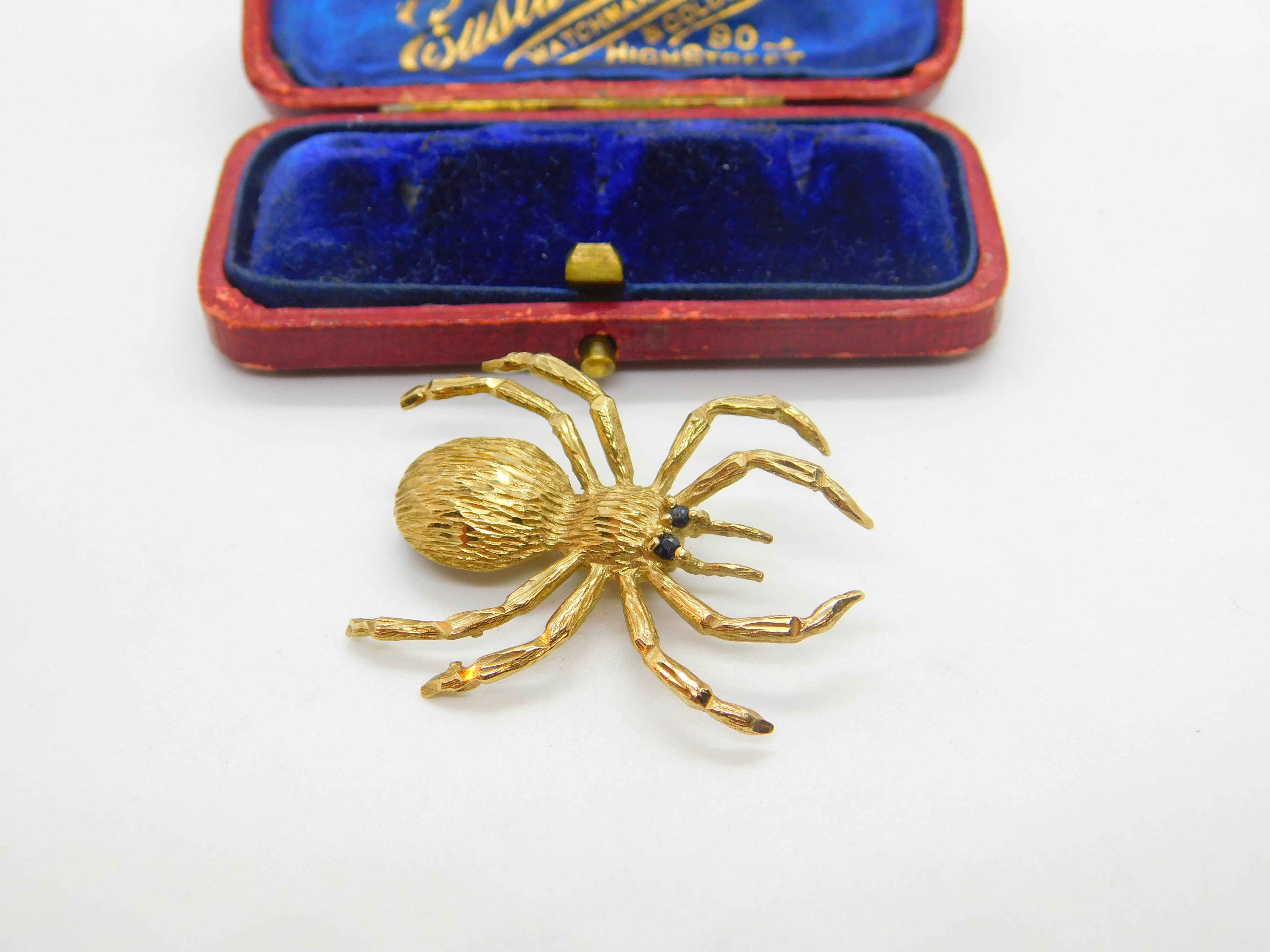 9ct Yellow Gold Spider Brooch Pin with Sapphire Eyes Vintage c1970 Birmingham