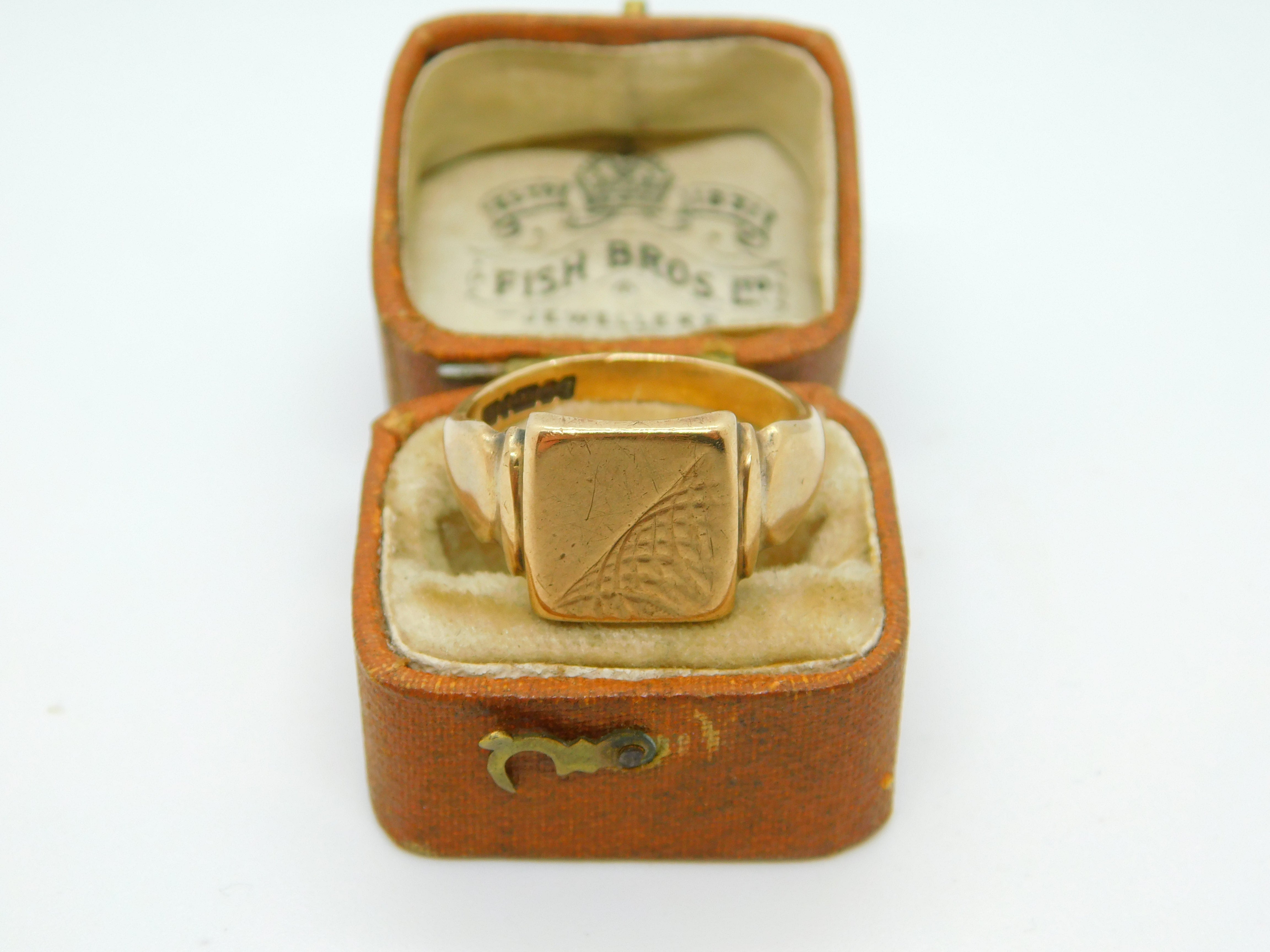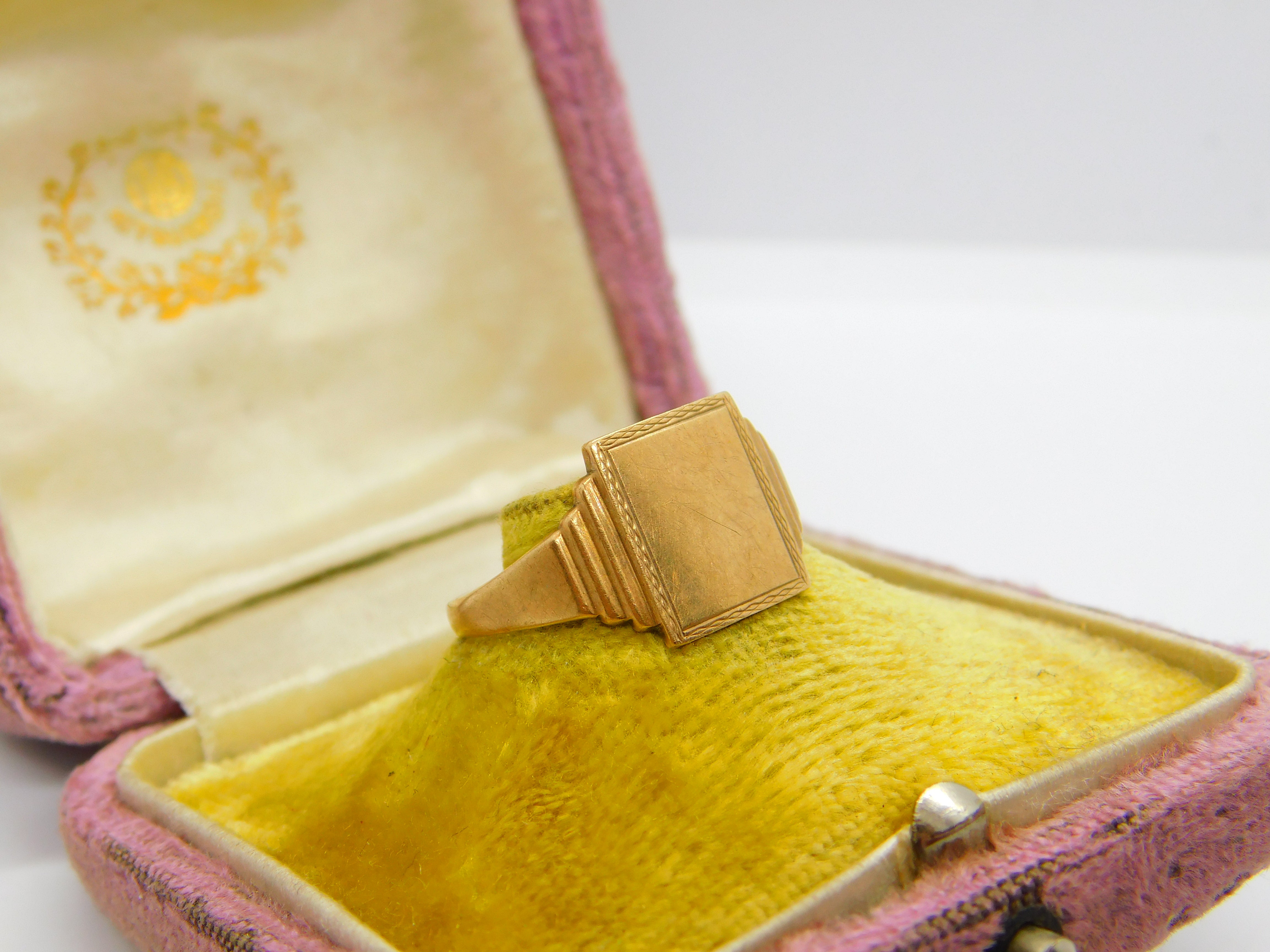 9ct Yellow Gold Square Signet Ring Vintage 1956 Birmingham Size R 1/2 UK