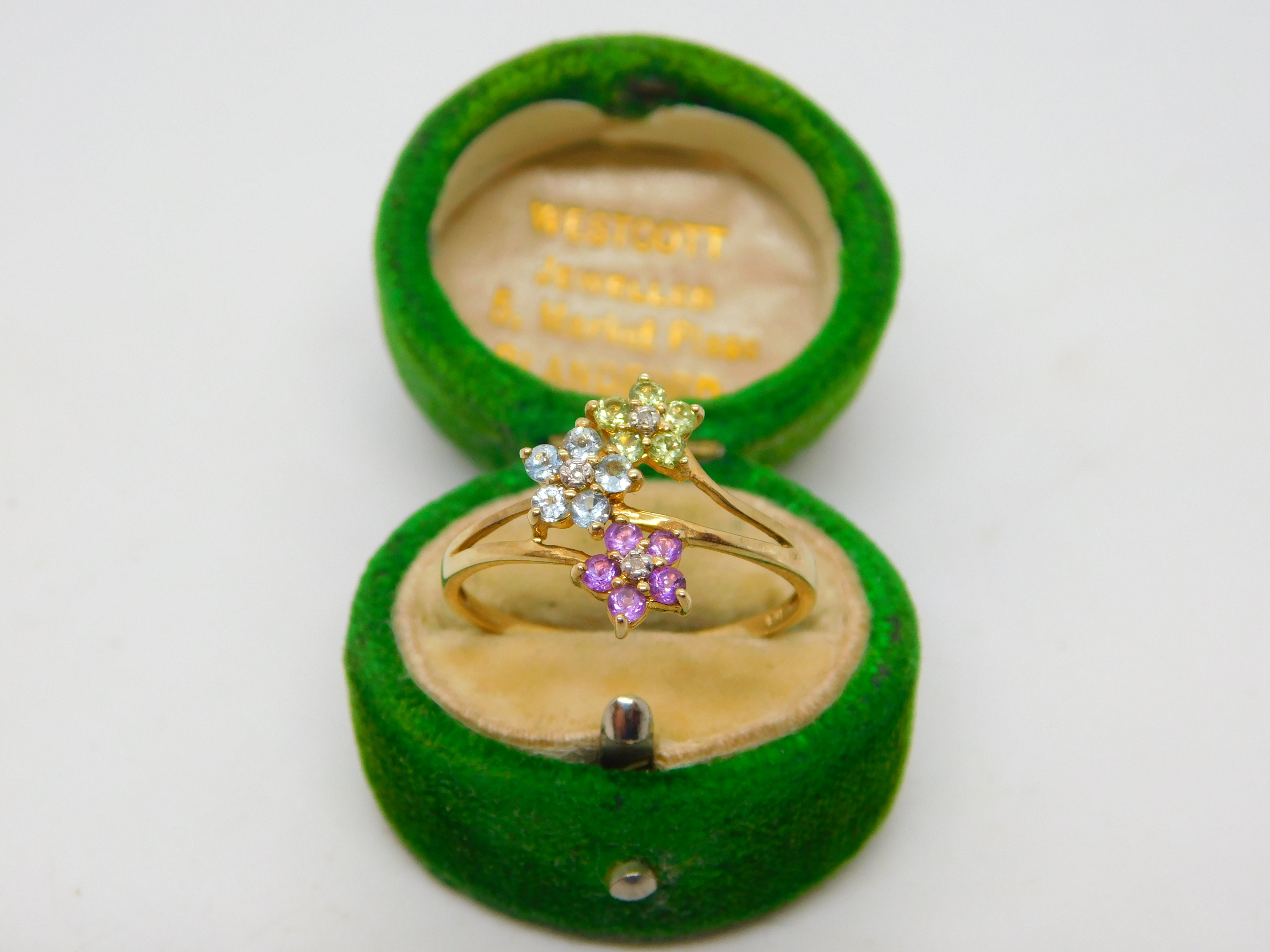 9ct Yellow Gold, Diamond, Amethyst Set Floral Dress Ring Vintage Birmingham