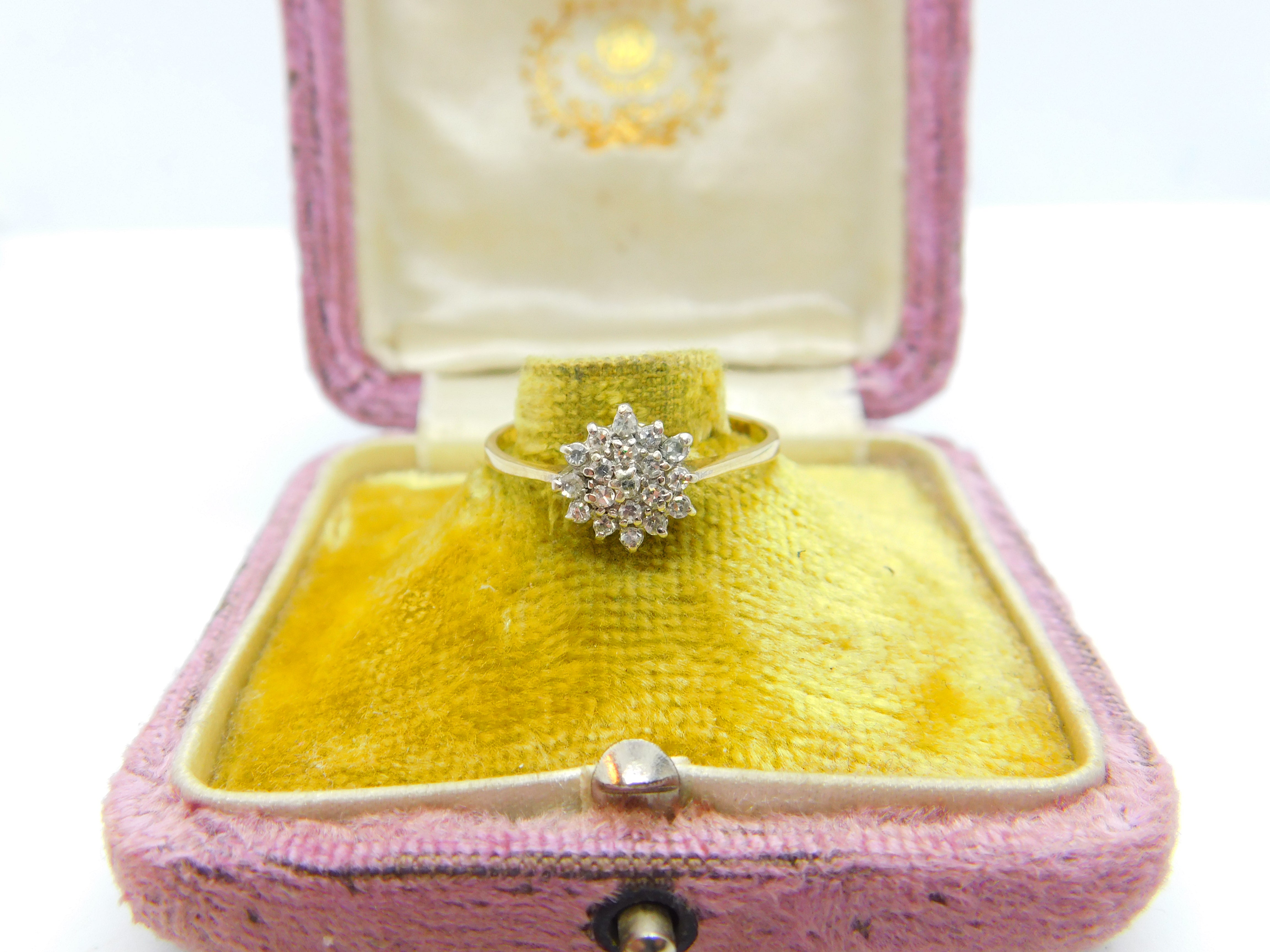 9ct Yellow Gold, Diamond Set Floral Cluster Ring 1986 London Vintage