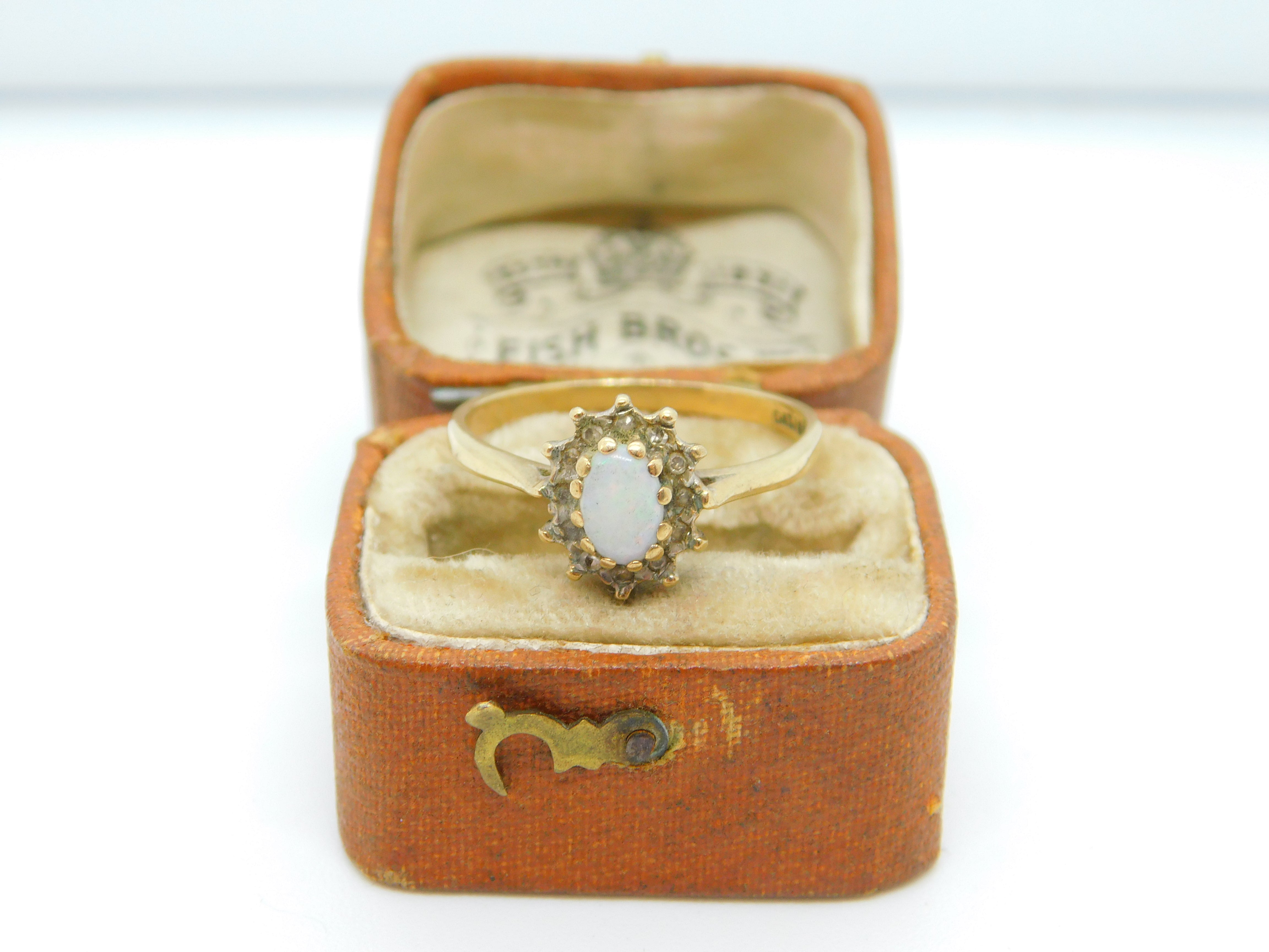 9ct Yellow Gold, Diamond & Opal Floral Cluster Ring Vintage 1986 London